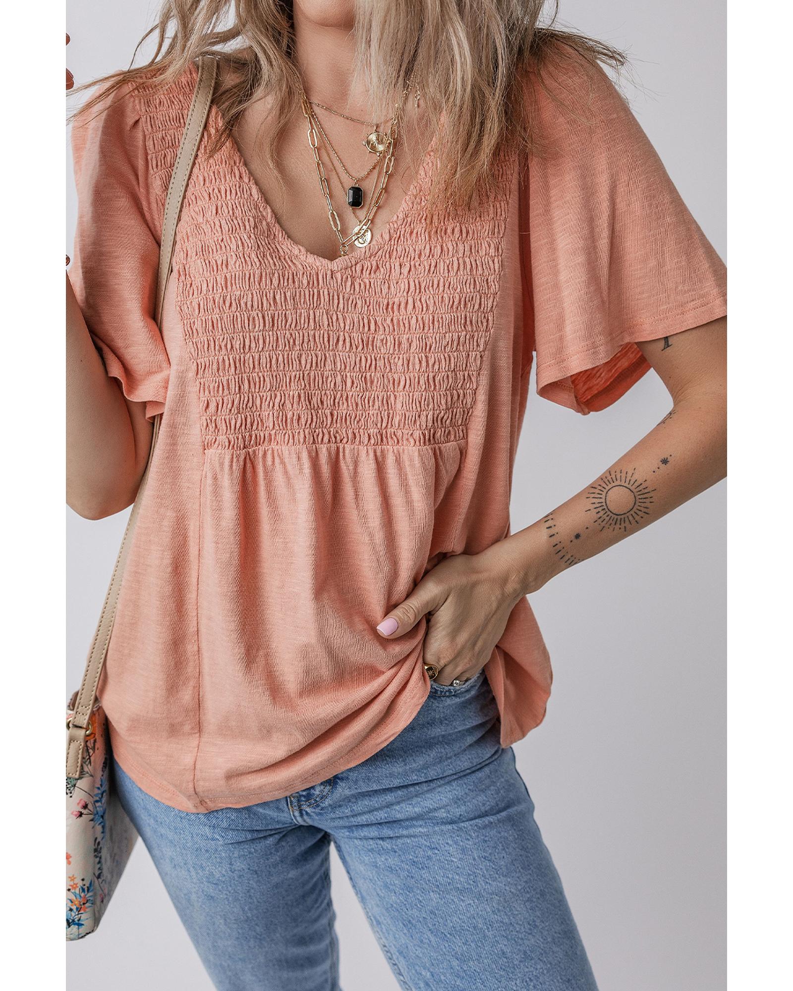 Fushia Smocked Front V Neck Pleated Babydoll Short Sleeve Top - S