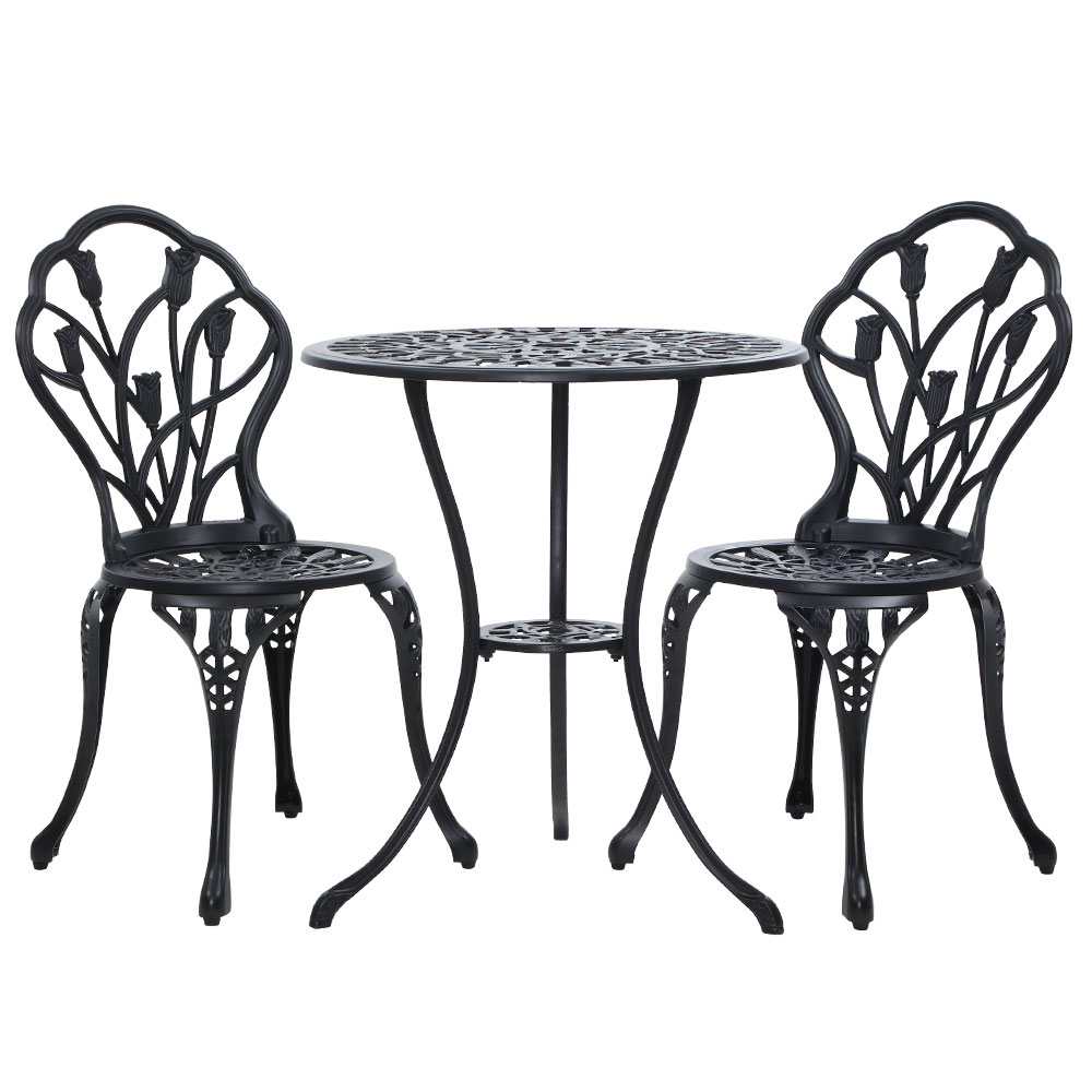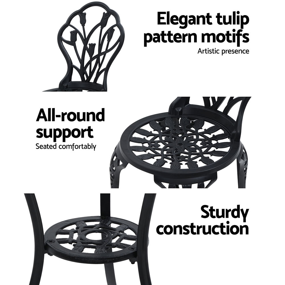Gardeon 3PC Outdoor Setting Bistro Set Chairs Table Cast Aluminum Patio Furniture Tulip Black