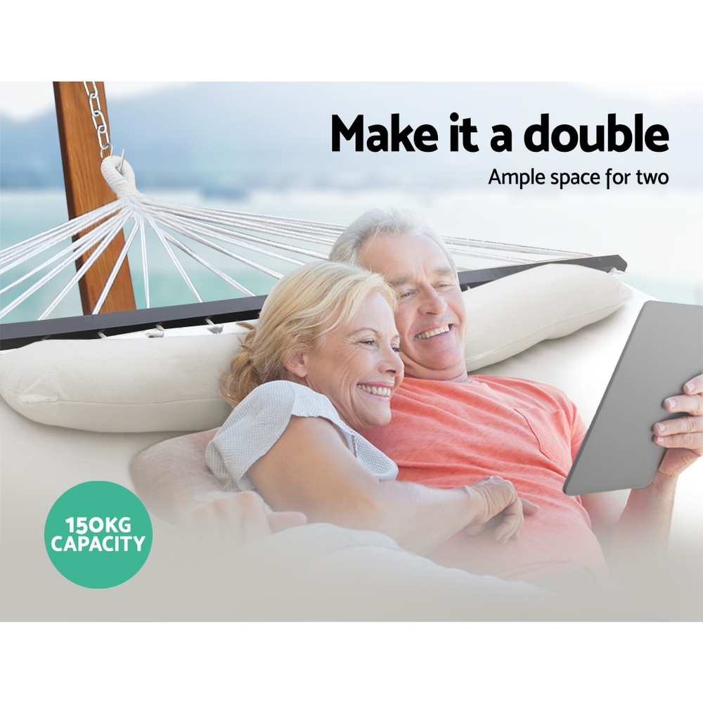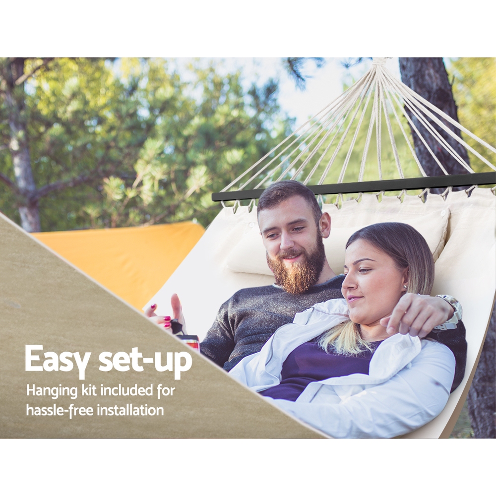 Love hanging around the patio? Or the garden? Or indoors? Our Gardeon 2-person Hammock will get you and your favourite person comfortable in no time at all. Made from a quality polyester and cotton blend fabric, our 2-person hammock can rope in a maximum of 150kg in weight. The smooth timber rails also helped to give a good balance to the hammock as well as some stylish touches. A detachable soft pillow is also included. Not least, it is easy to install with a hanging kit included for a hassle-free set-up.