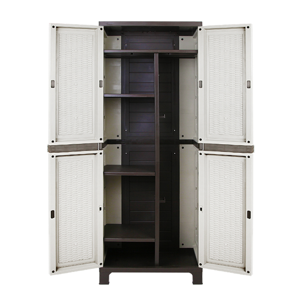 Outside, the weather-resistant Storage Cabinet features premium plastic construction with corrugated panels for both reinforced support and stylish looks. Security and safety is also enhanced with lockable doors that can be secured with a range of locks. Not least, the entire unit stands on large stilted feet to keep it away from floods, spills or wet floors.