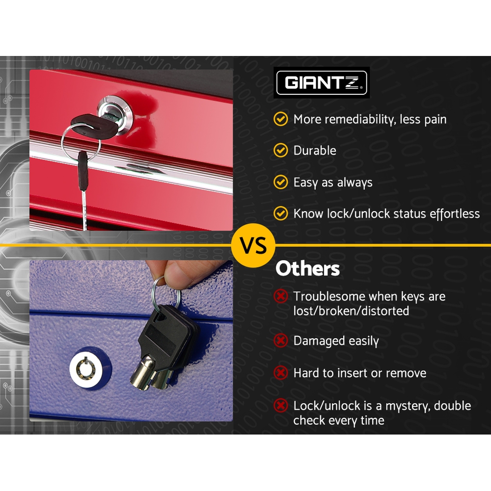This robust, multi-drawer Giantz Tool Trolley is an essential for any workshop. Crafted from durable steel, it features smooth ball-bearing slides for easy access and a secure lock system for safety. Its spacious design includes varying drawer sizes to accommodate tools of all shapes, complete with non-slip liners. The chest is also mounted on omni-directional castors with locakble front wheels, ensuring a smooth maneuverability and stable positioning. Sleek and functional, it’s perfect for organizing and protecting your valuable tools.
