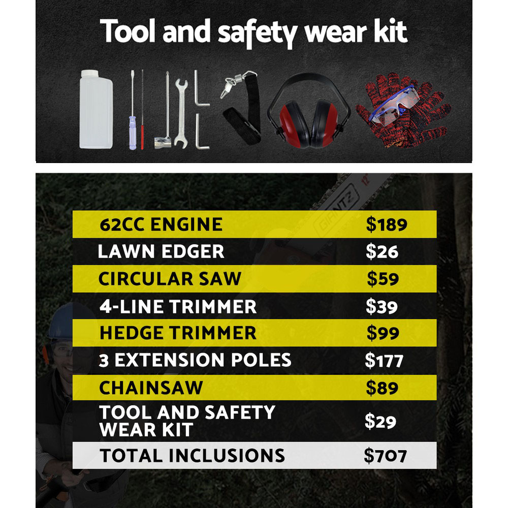 So hesitate no more. Lay your hands on some serious tools to get your garden into tip top shape with the GIANTZ Multi-tool Gardener that comes loaded with a bonus accessory kit, including gloves, earmuffs, mini toolkit and fuel mixer.