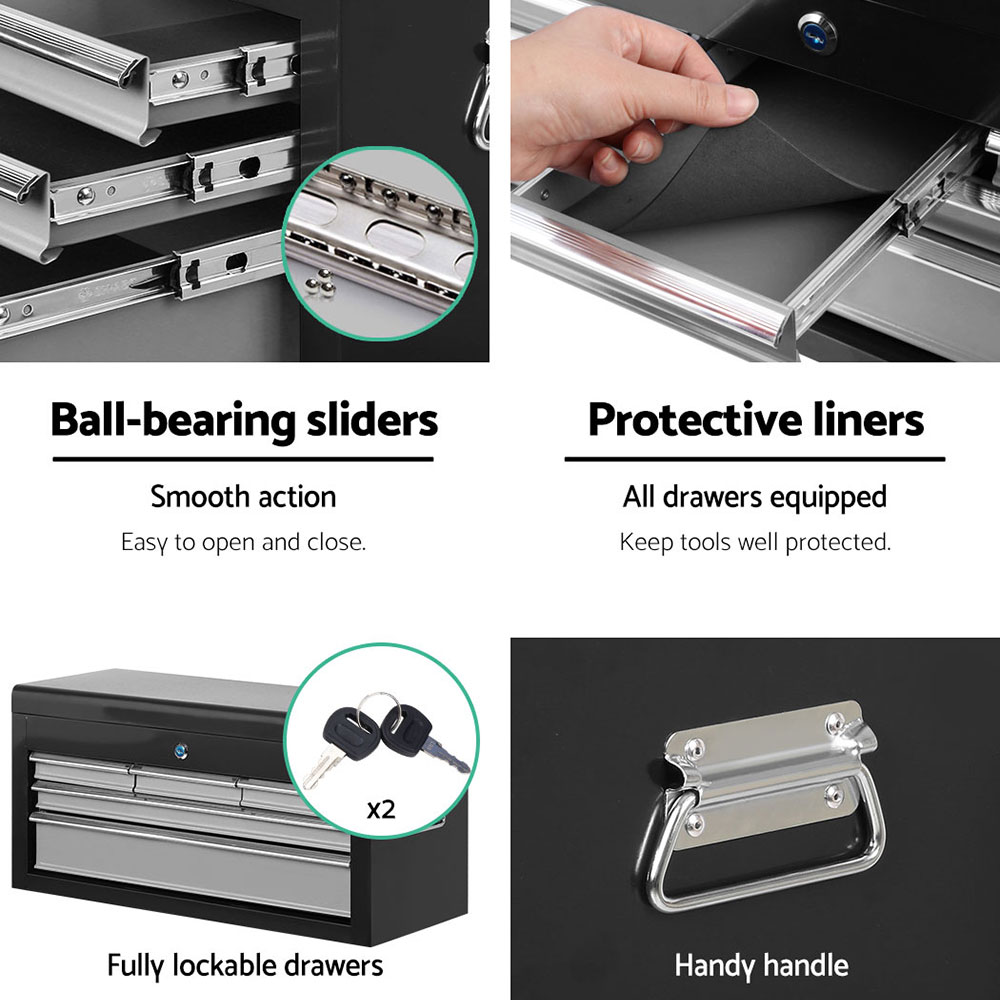 This robust, multi-drawer Giantz Tool Trolley is an essential for any workshop. Crafted from durable steel, it features smooth ball-bearing slides for easy access and a secure lock system for safety. Its spacious design includes varying drawer sizes to accommodate tools of all shapes, complete with non-slip liners. The chest is also mounted on omni-directional castors with locakble front wheels, ensuring a smooth maneuverability and stable positioning. Sleek and functional, it’s perfect for organizing and protecting your valuable tools.