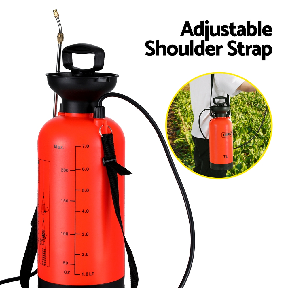 When the sun is out, the weeds will sprout. Forget about the laborious tasks of weeding, fertilizing and cleaning by hand – the Giantz Pressure Sprayer turns your chores into an effortless job. This delivery system fits comfortably on your back for total mobility, and the large tank has a 7L capacity. Use the pressure sprayer to water the garden, spread fertilizer, dispense herbicides and pesticides, care for livestock, or do general spray cleaning around the home. The heavy-duty shoulder strap keeps the device fixed and comfortable on your back. It features a built-in shut-off valve and a safe release valve to release unwanted pressure. Compact and portable, the Giantz Pressure Sprayer makes caring for your garden easier than ever.