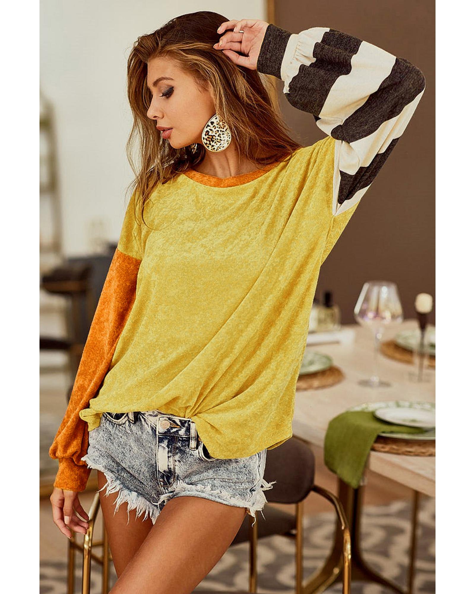 - Ginger Colorblock Striped Sleeve Patchwork Drop Shoulder Top