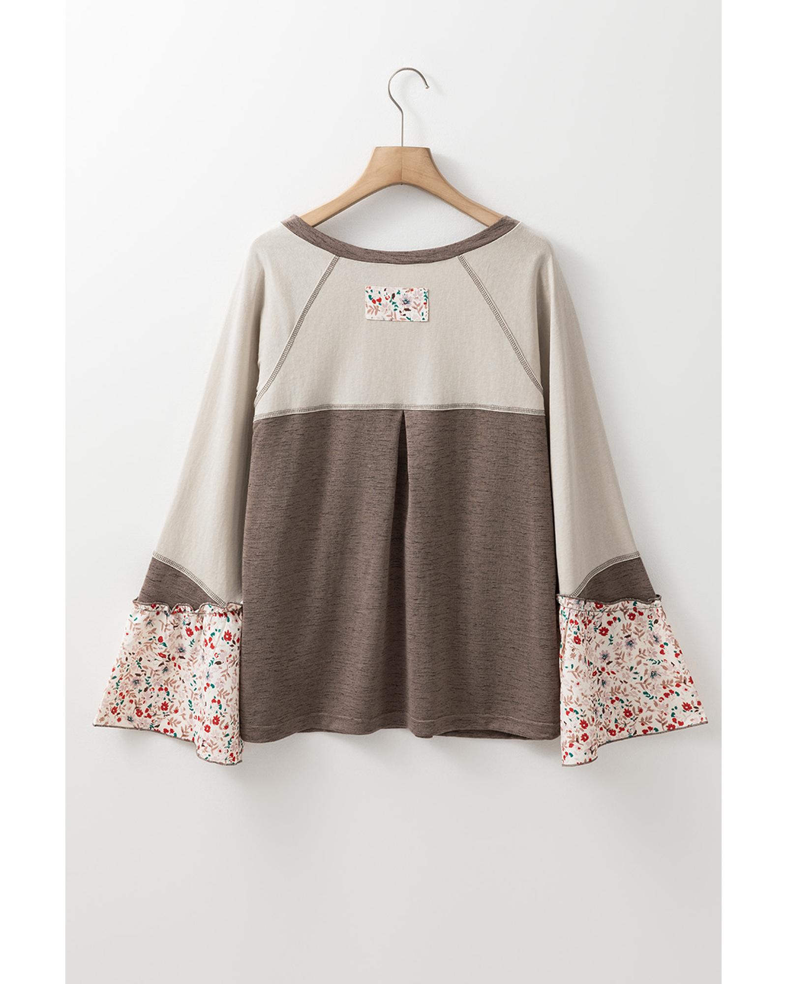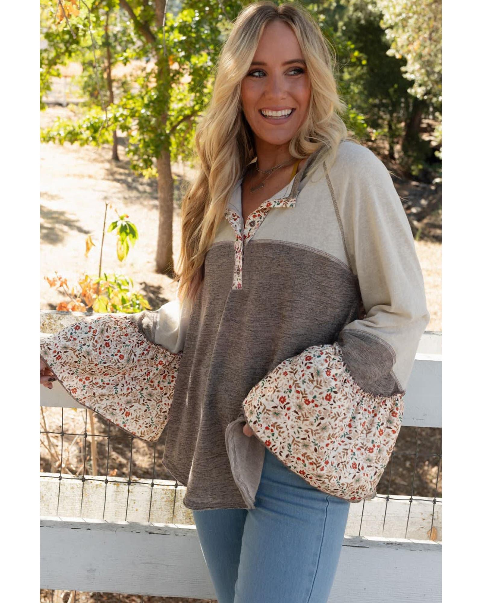 Goat Colorblock Floral Patchwork Flared Sleeve Buttons Henley Top – L