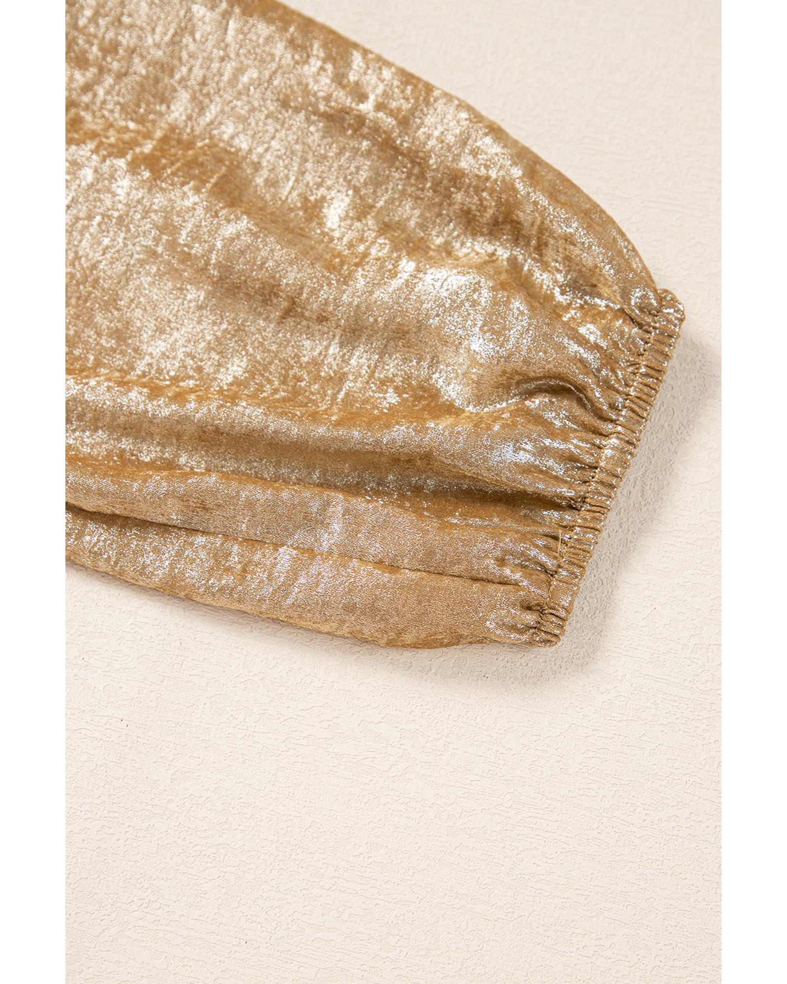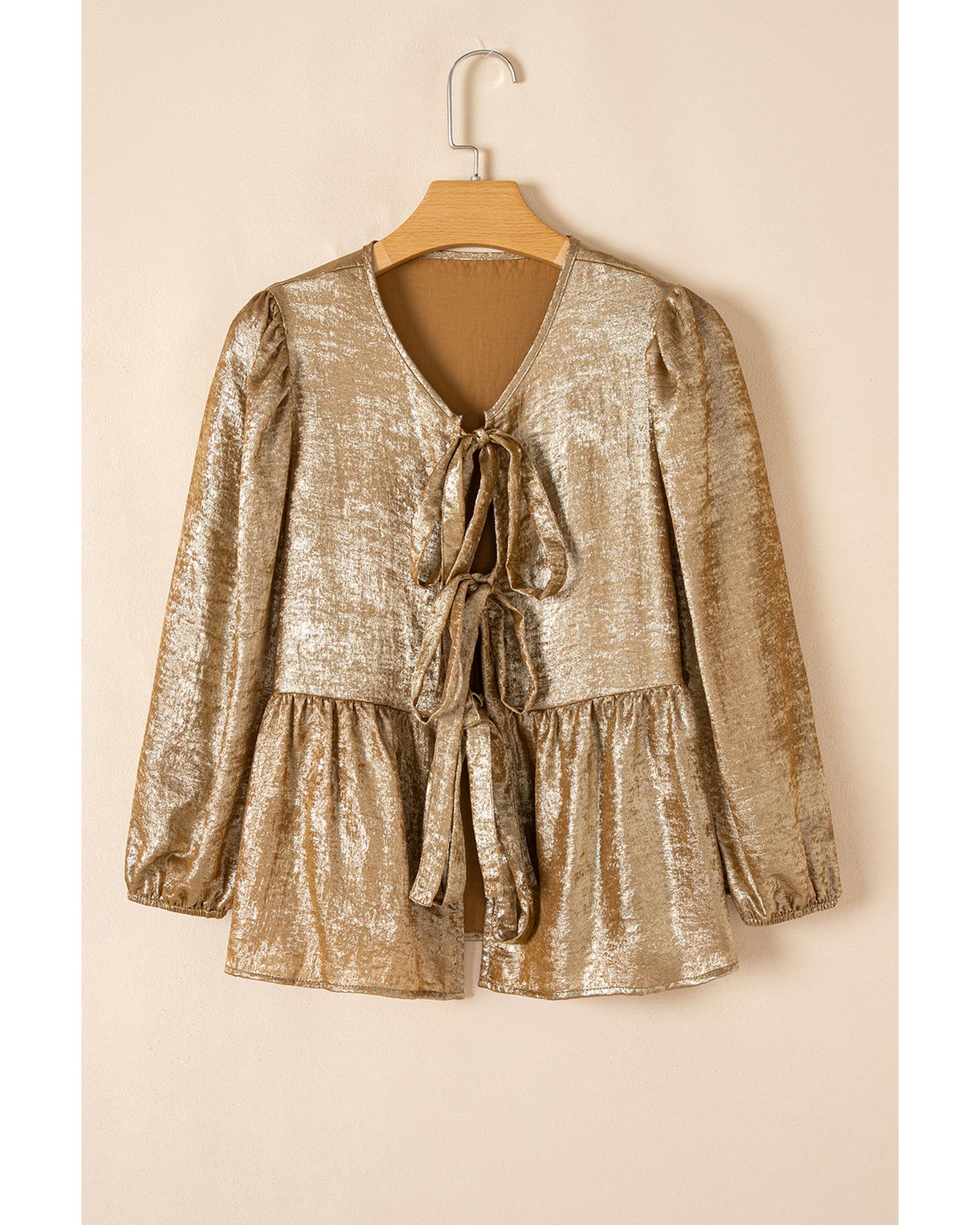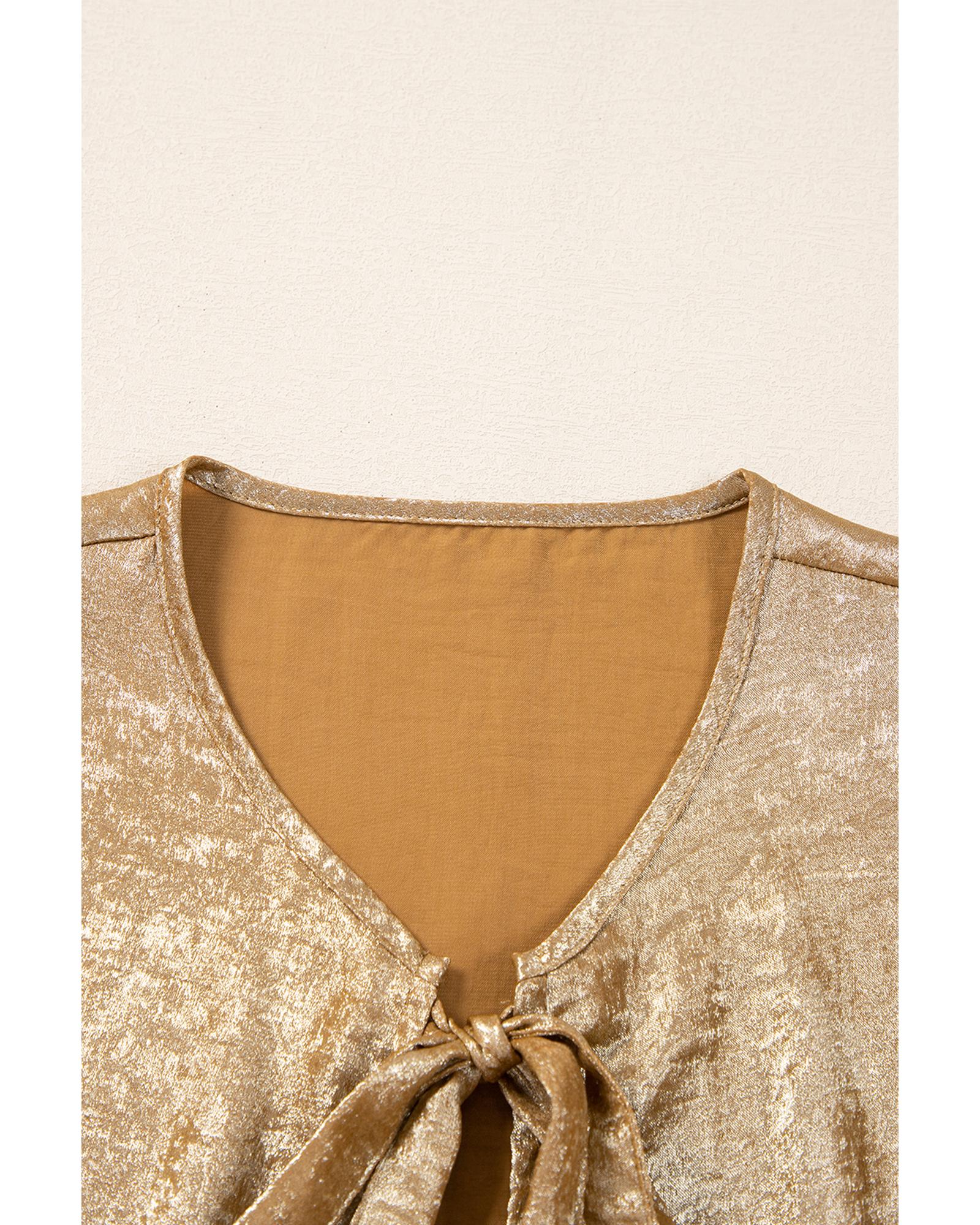 - Gold Bow Tie Front Puff 3/4 Sleeve Ruffle Hem Blouse