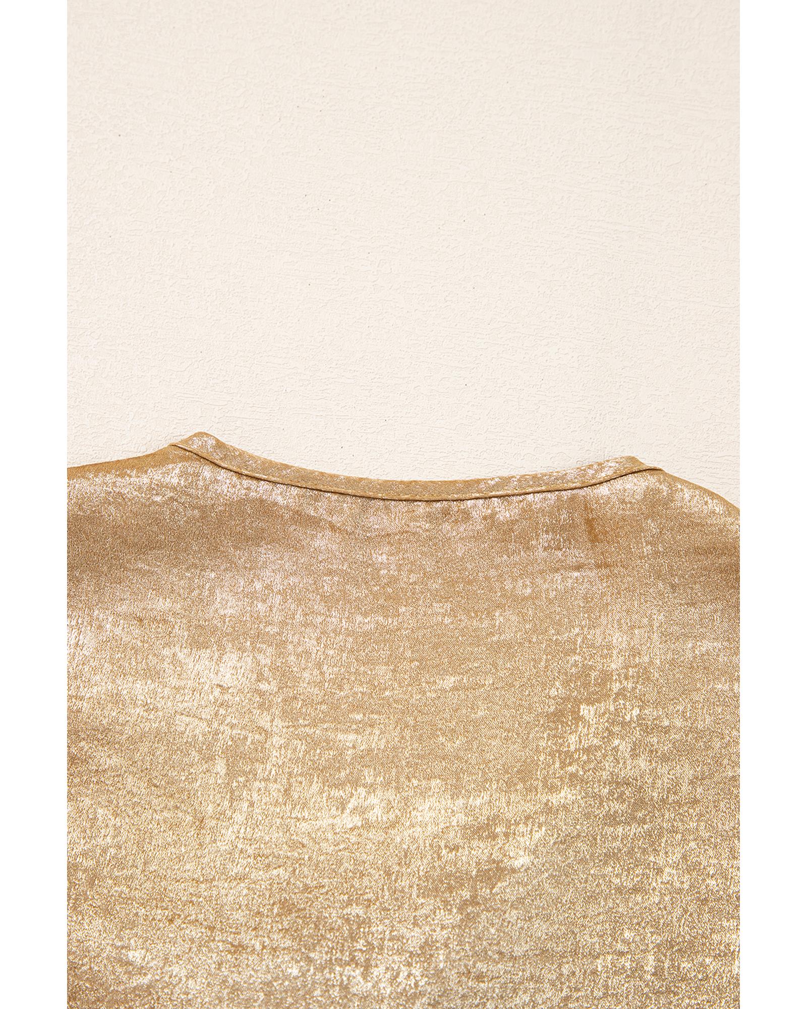Gold Bow Tie Front Puff 3/4 Sleeve Ruffle Hem Blouse – L