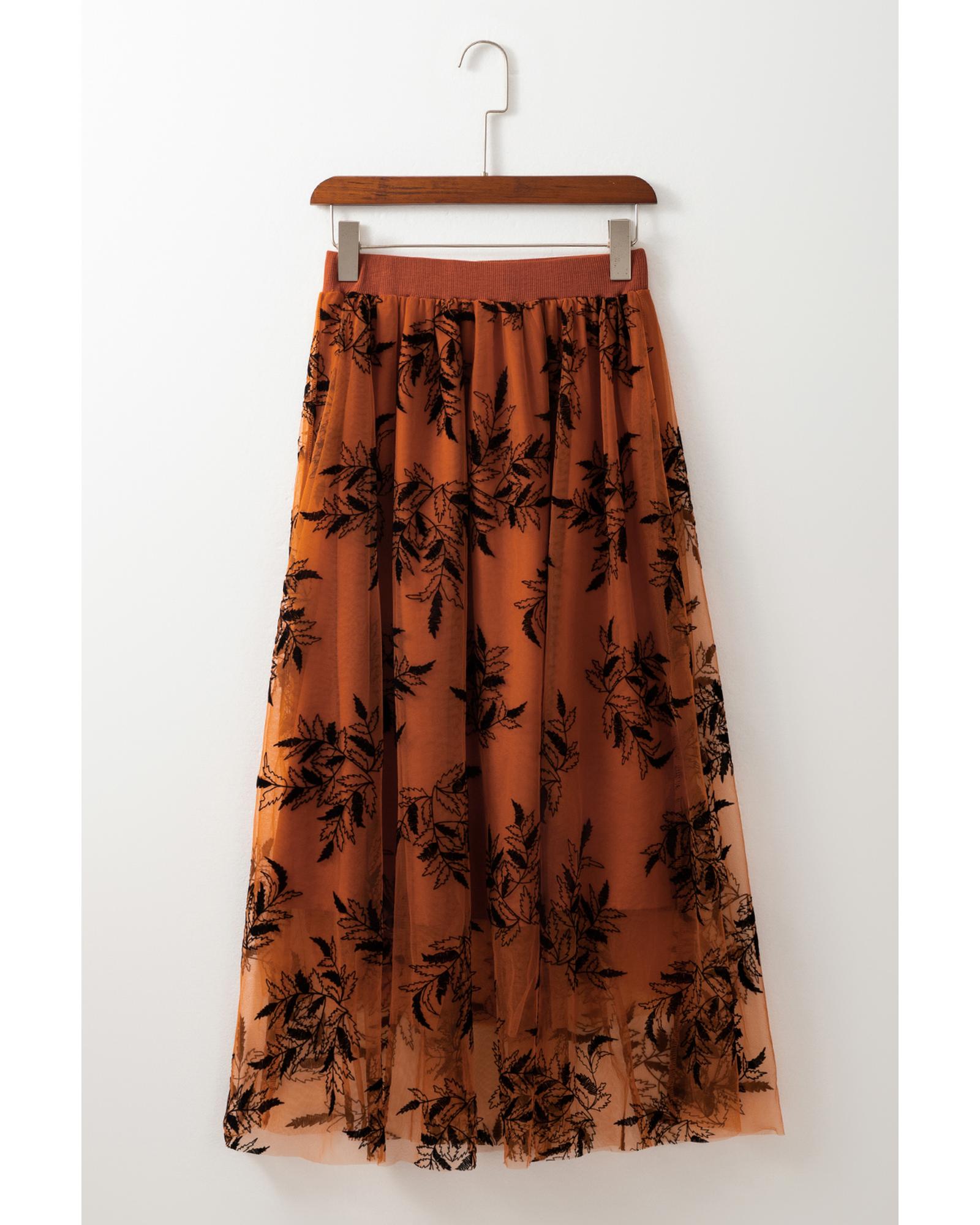 Gold Flame Floral Leaves Embroidered High Waist Maxi Skirt – L