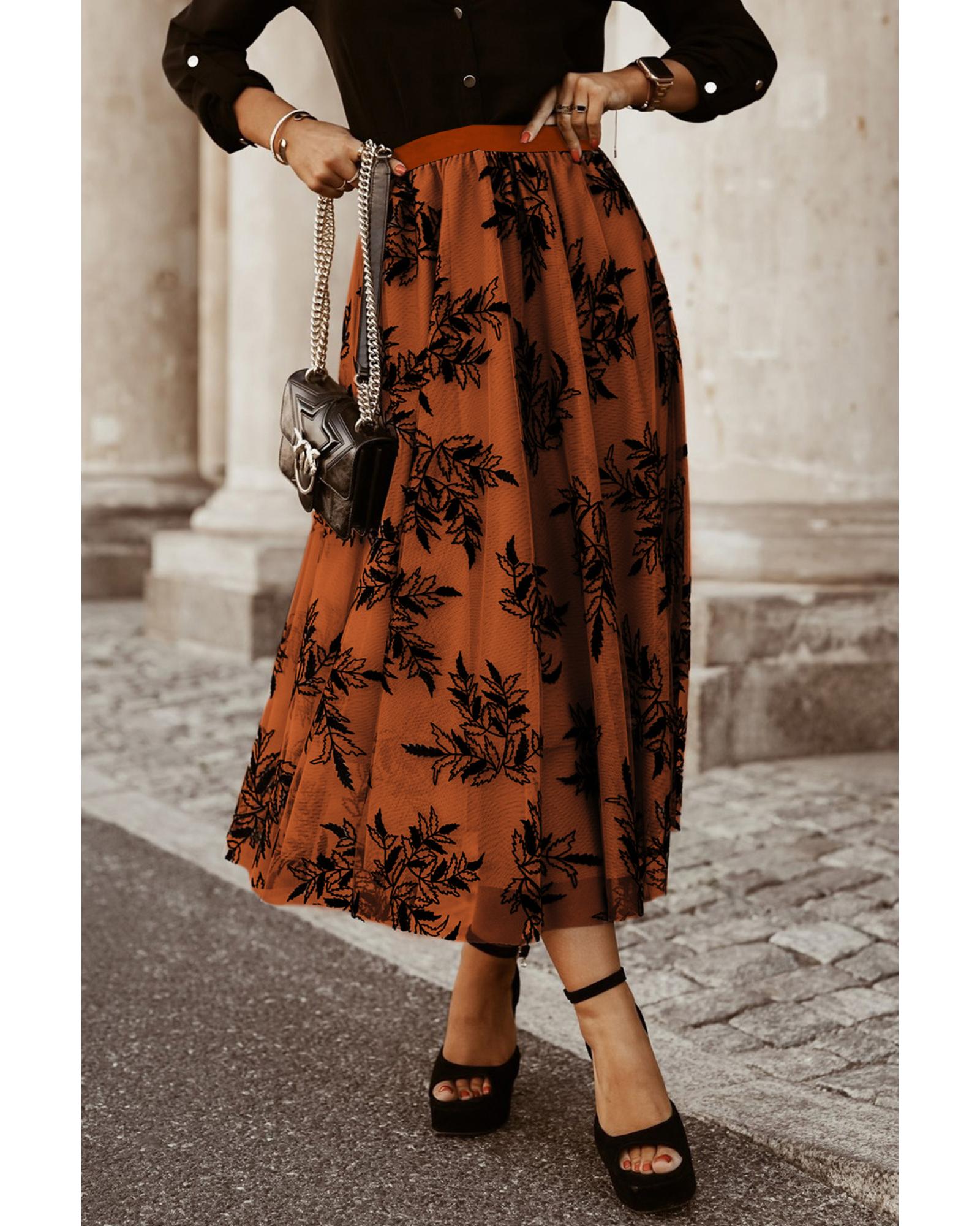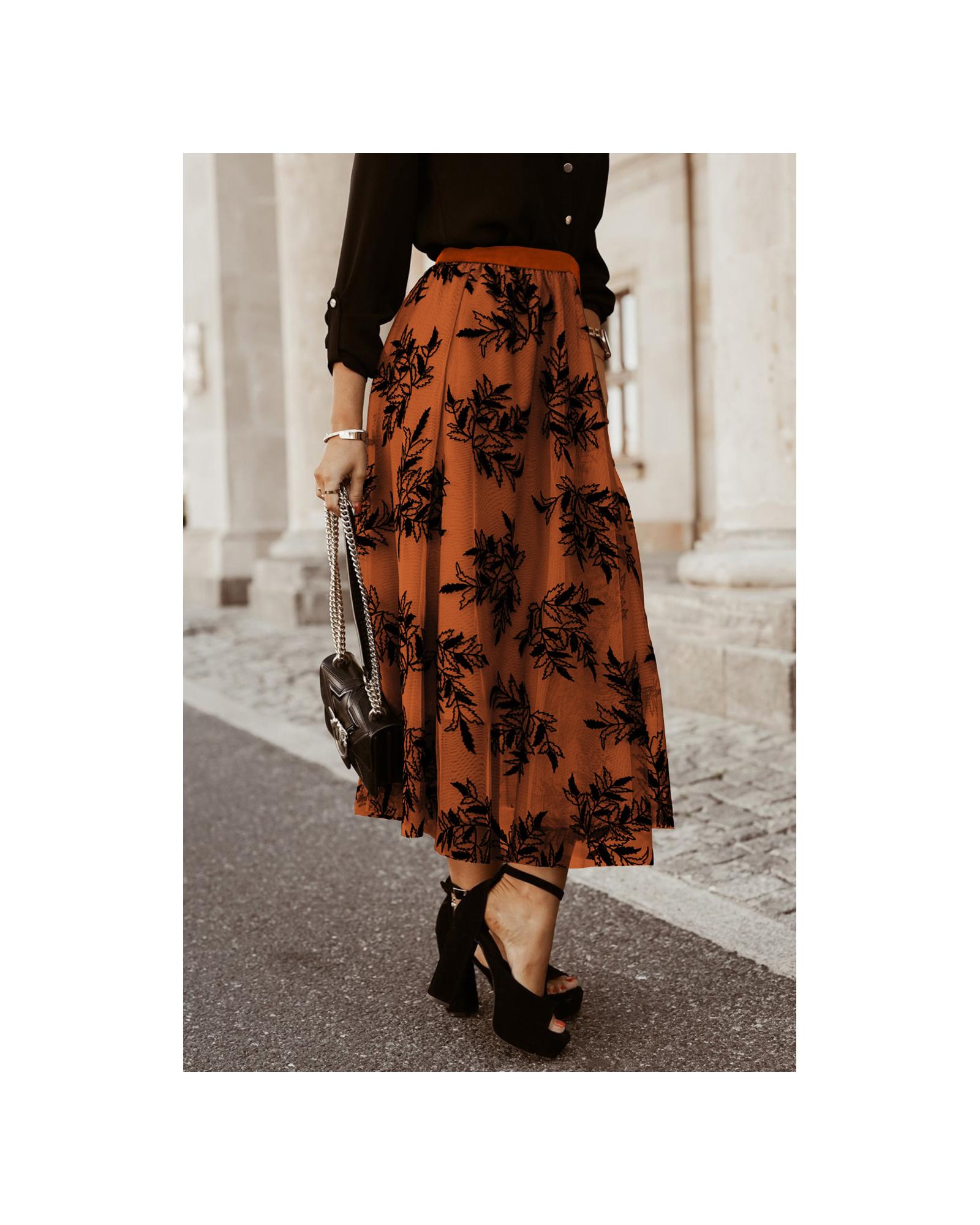 Gold Flame Floral Leaves Embroidered High Waist Maxi Skirt – M