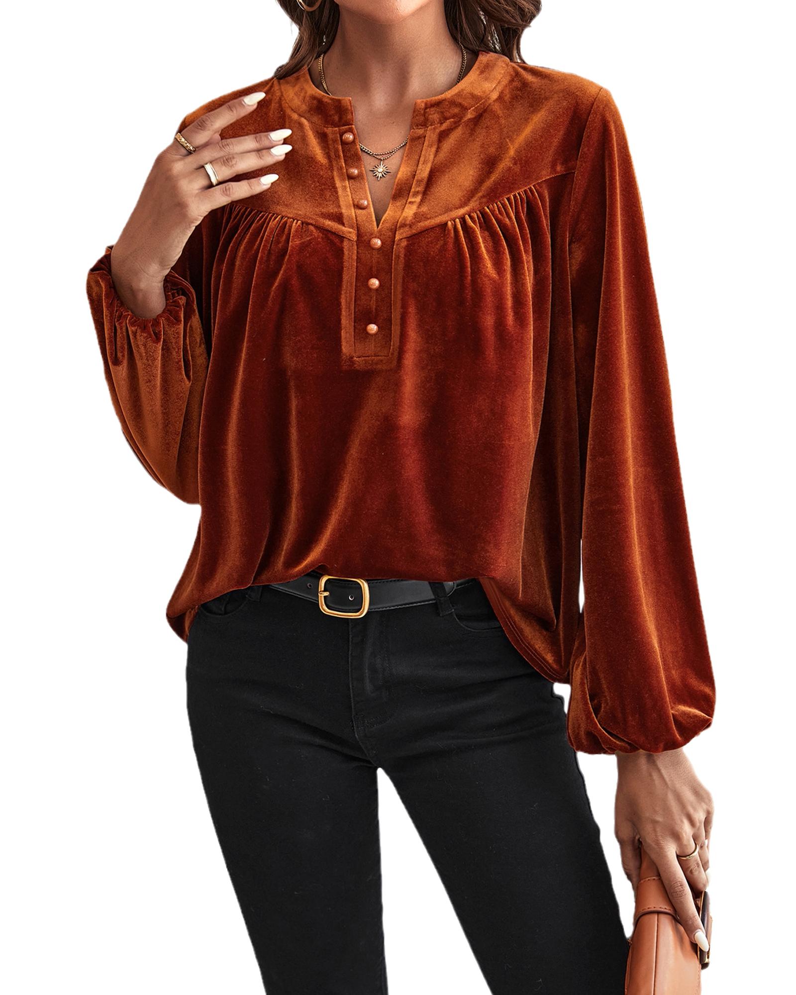 Gold Flame Lantern Sleeve Beaded Split V Neck Velvet Top – S