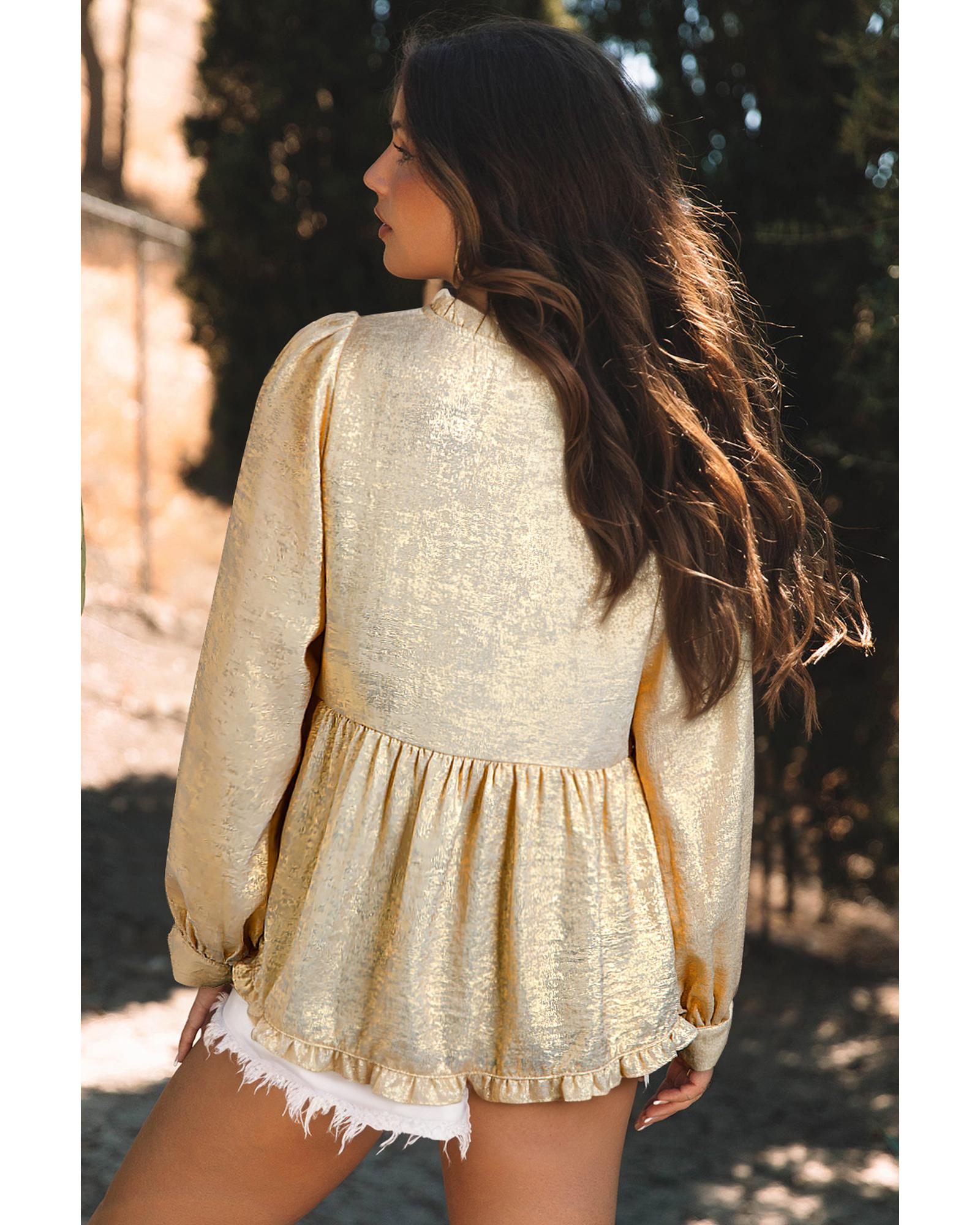Gold Metallic Frilled V Neck Puff Sleeve Babydoll Blouse – L