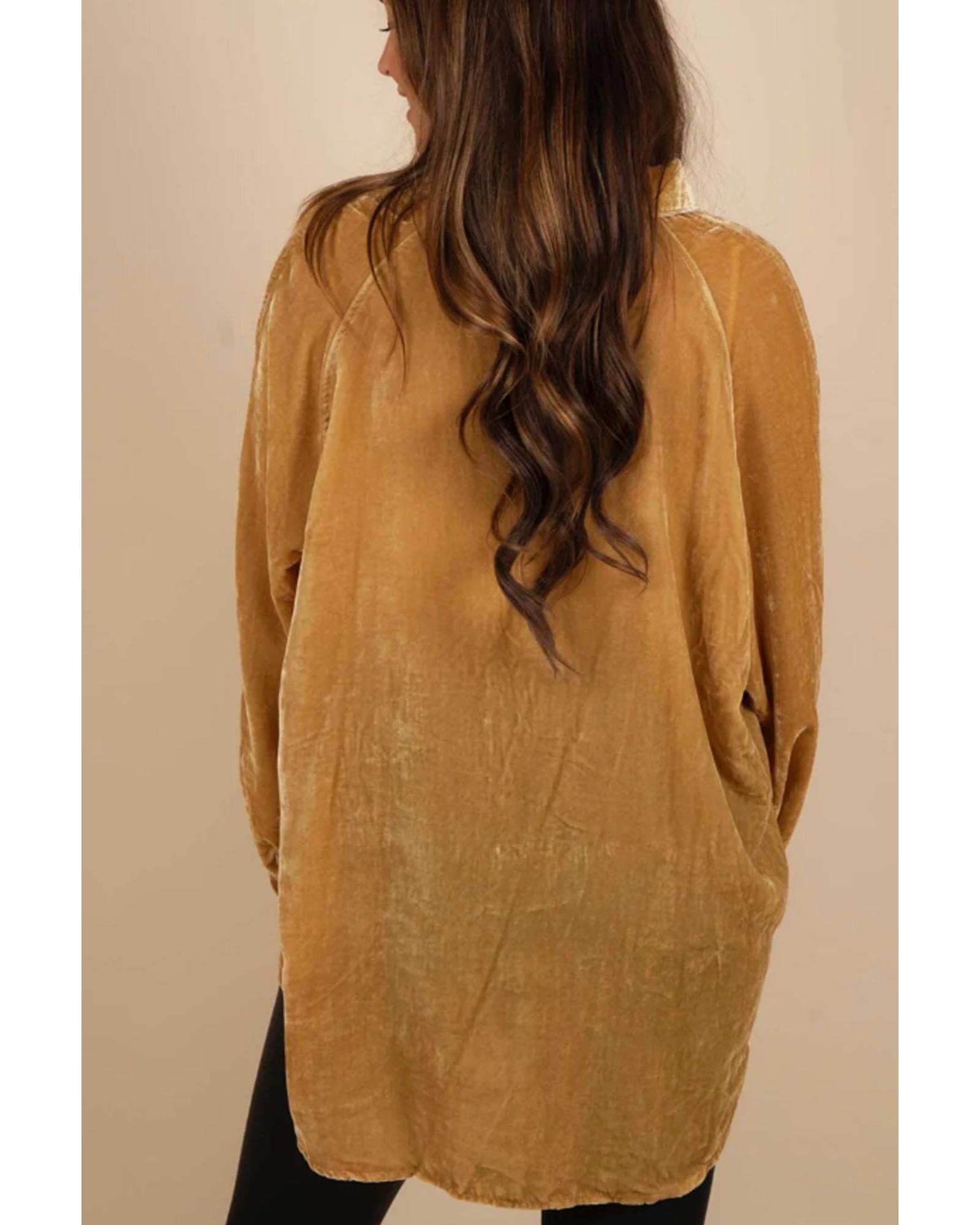 Gold Solid Color Button Up Loose Fit Velvet Shirt – M