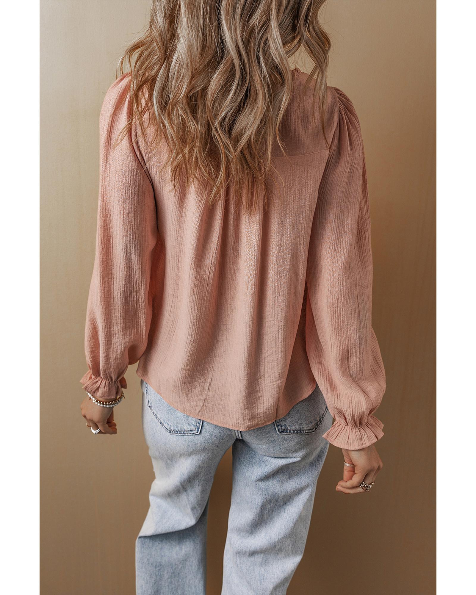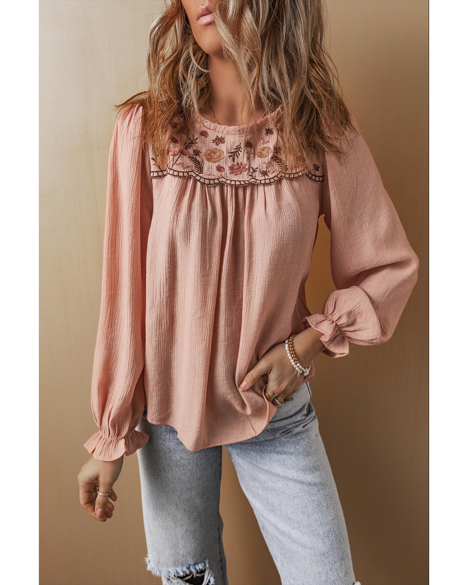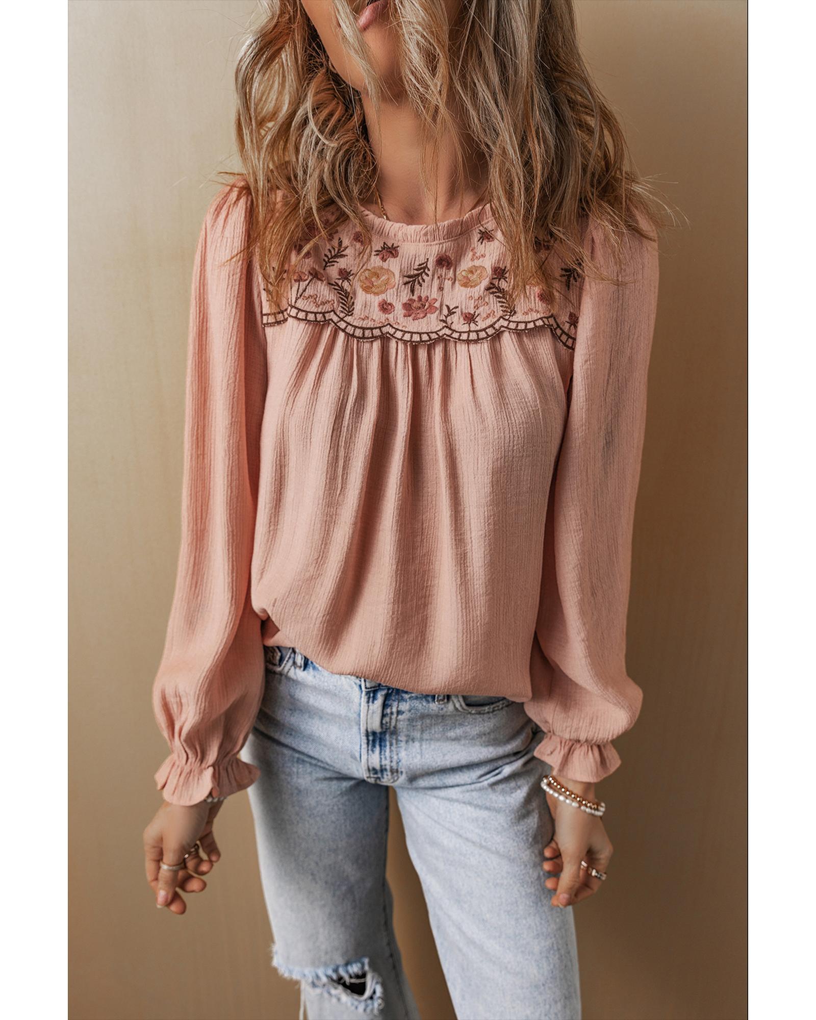 Gossamer Pink Floral Embroidered Textured Flounce Sleeve Elegant Blouse – XL