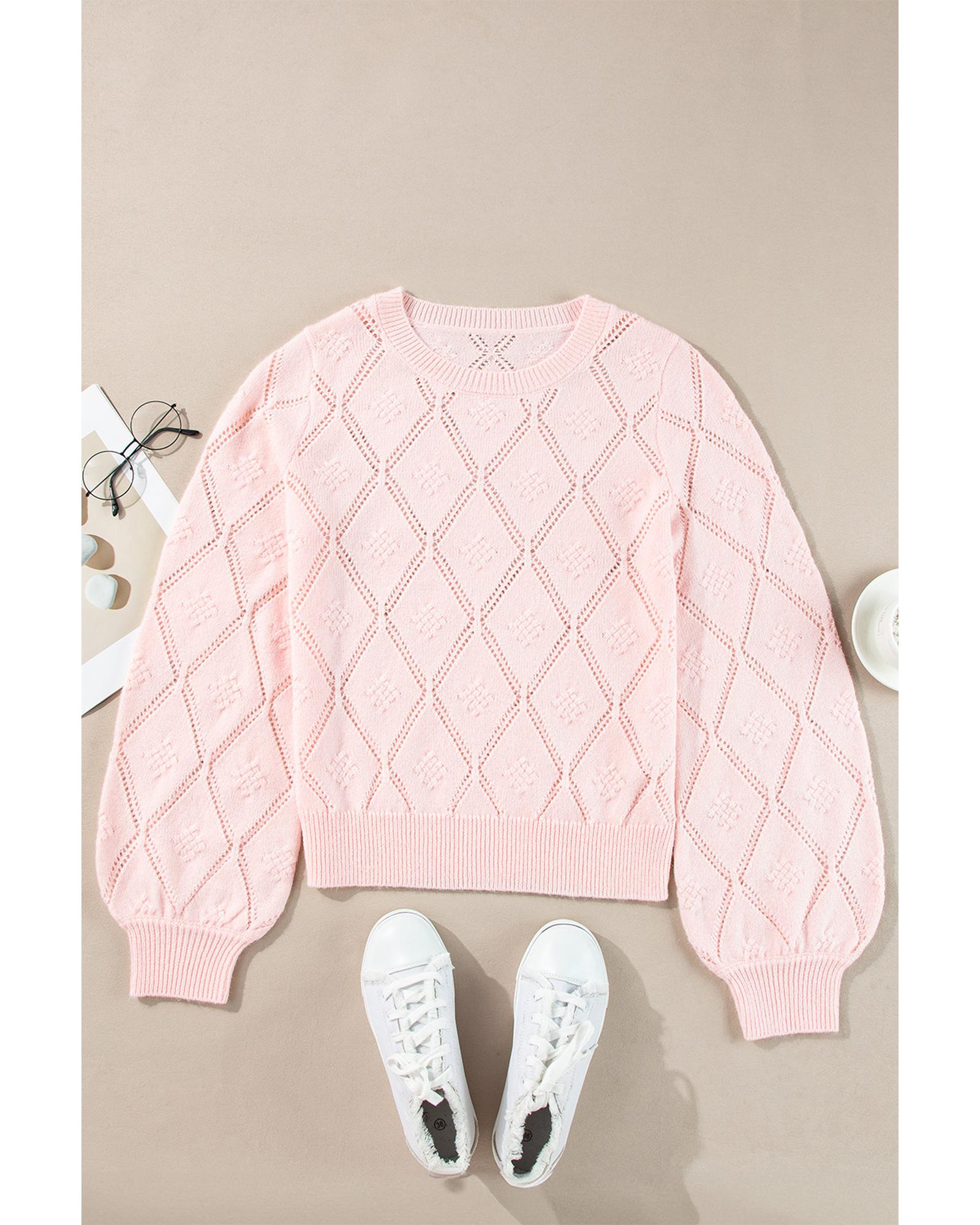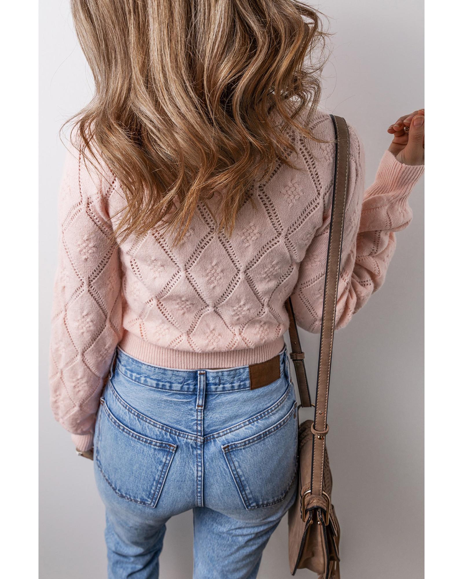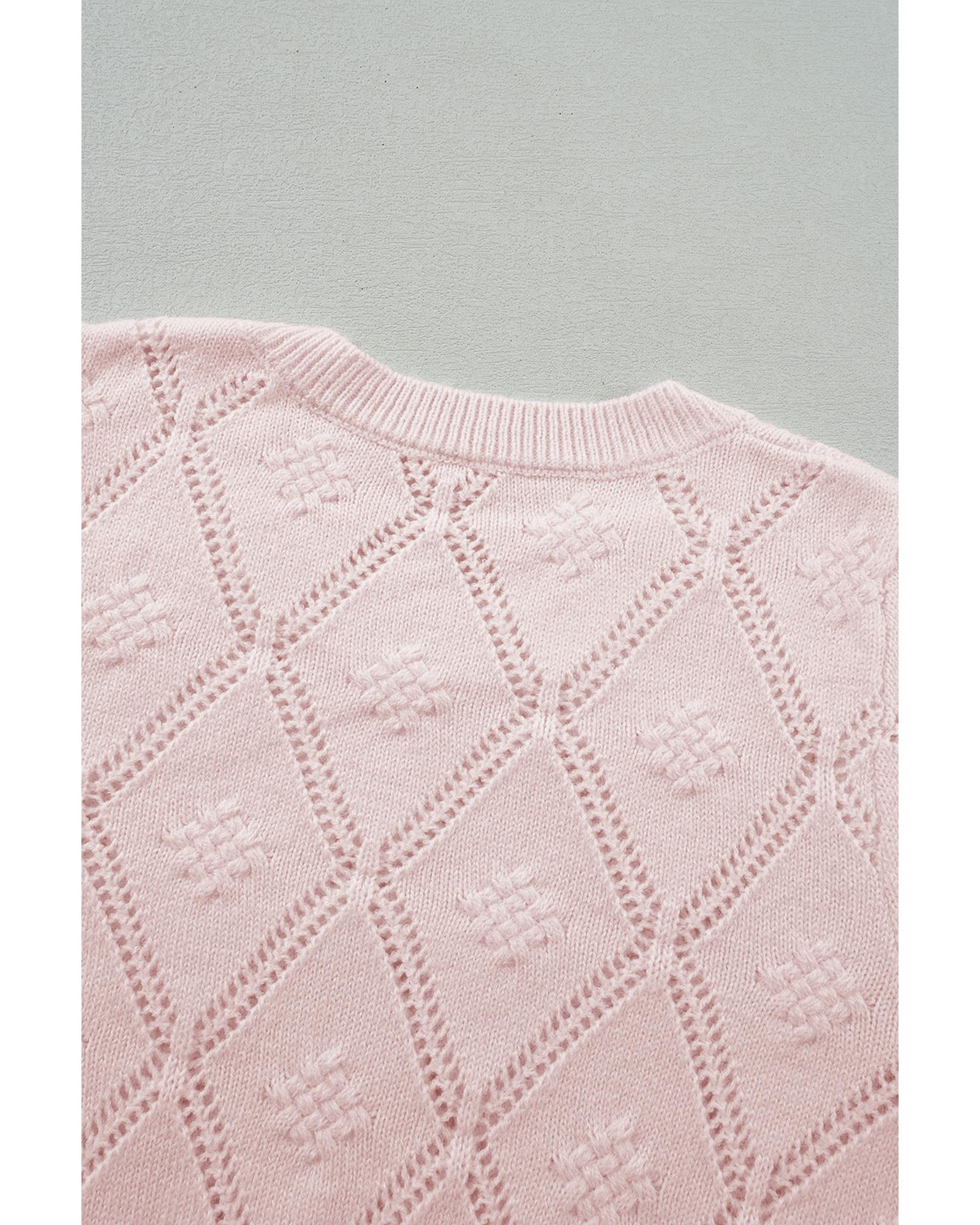 Gossamer Pink Openwork Plaid Puff Sleeve Cropped Sweater - XL