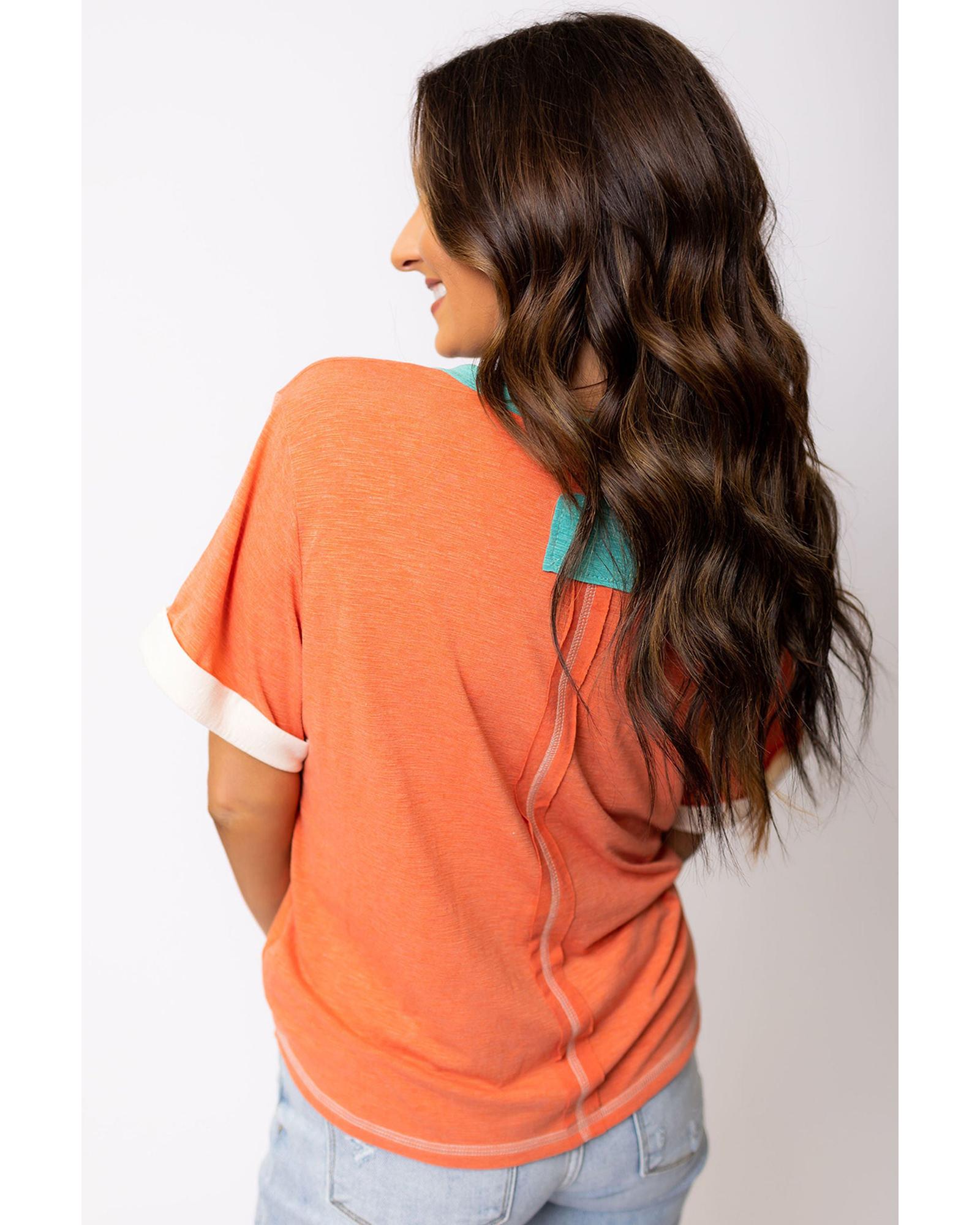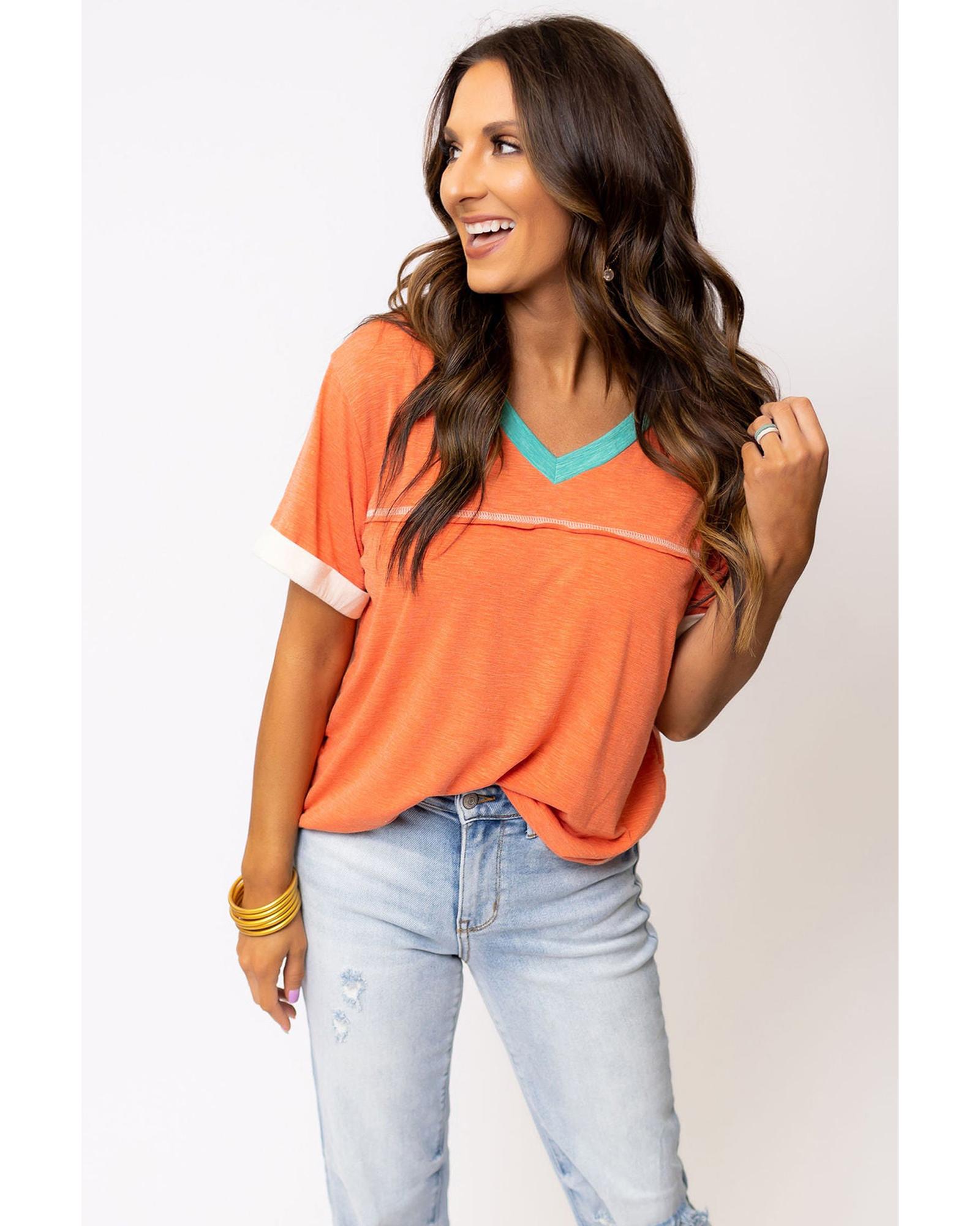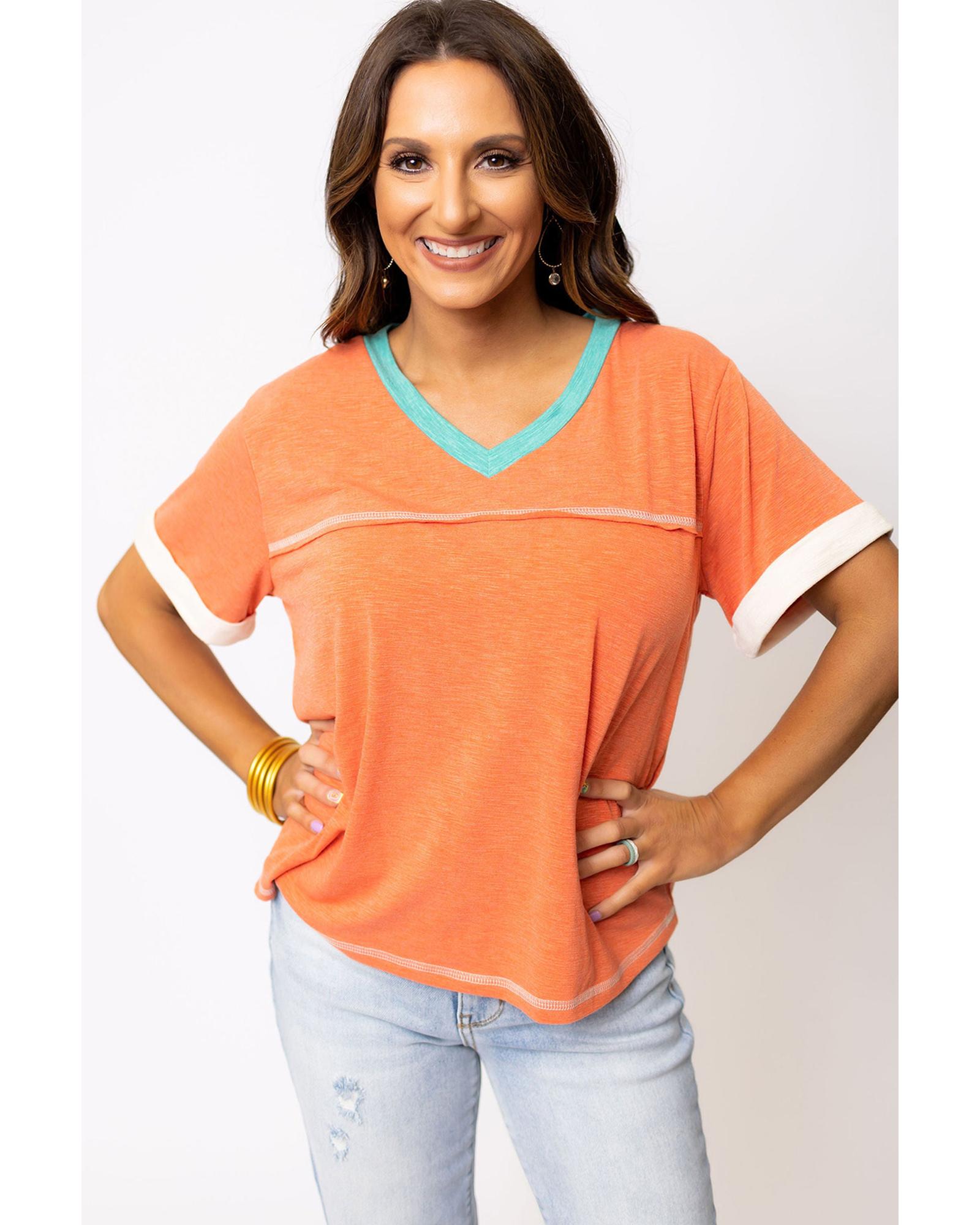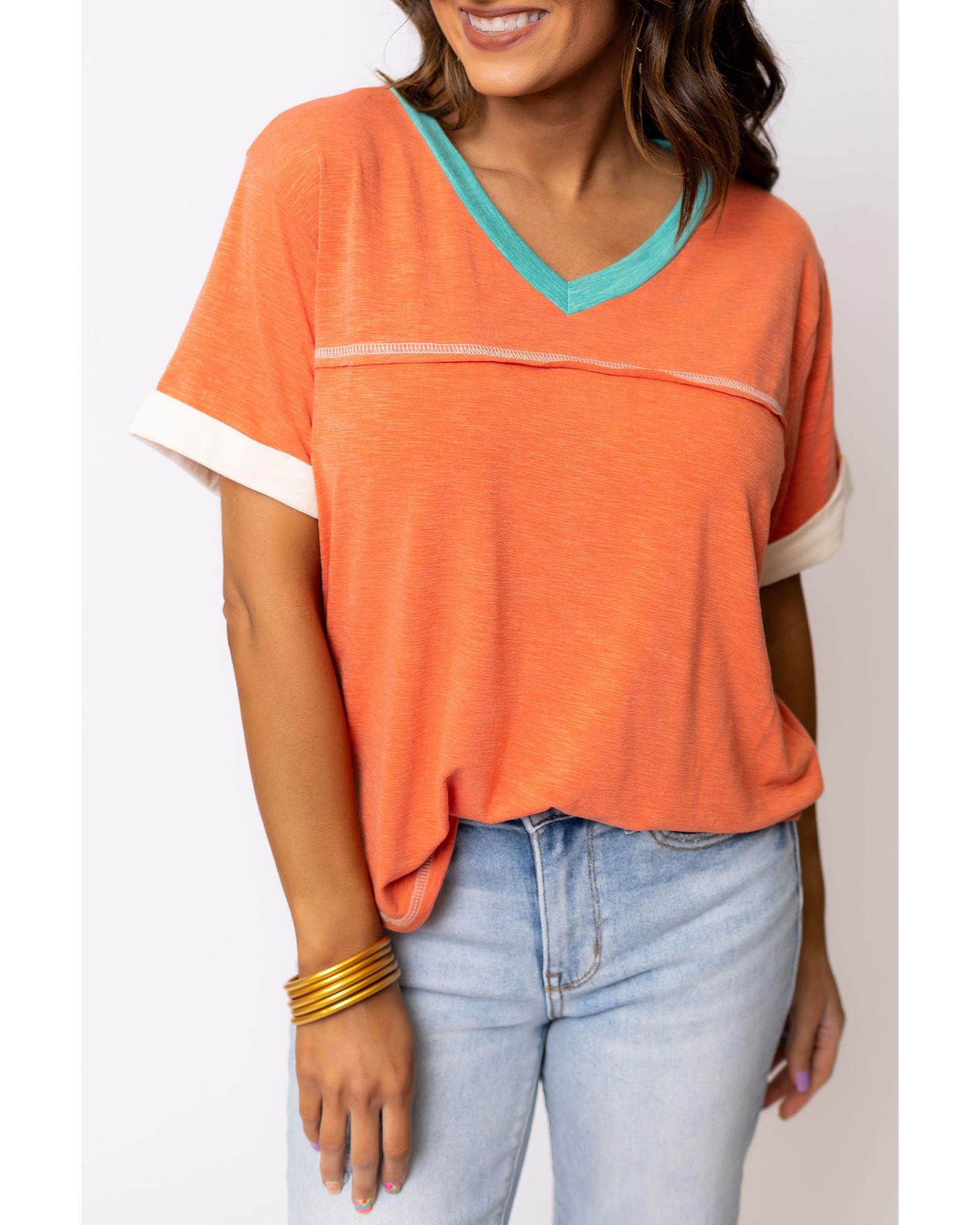 Grapefruit Orange Contrast Trim Exposed Seam V Neck T-shirt – S
