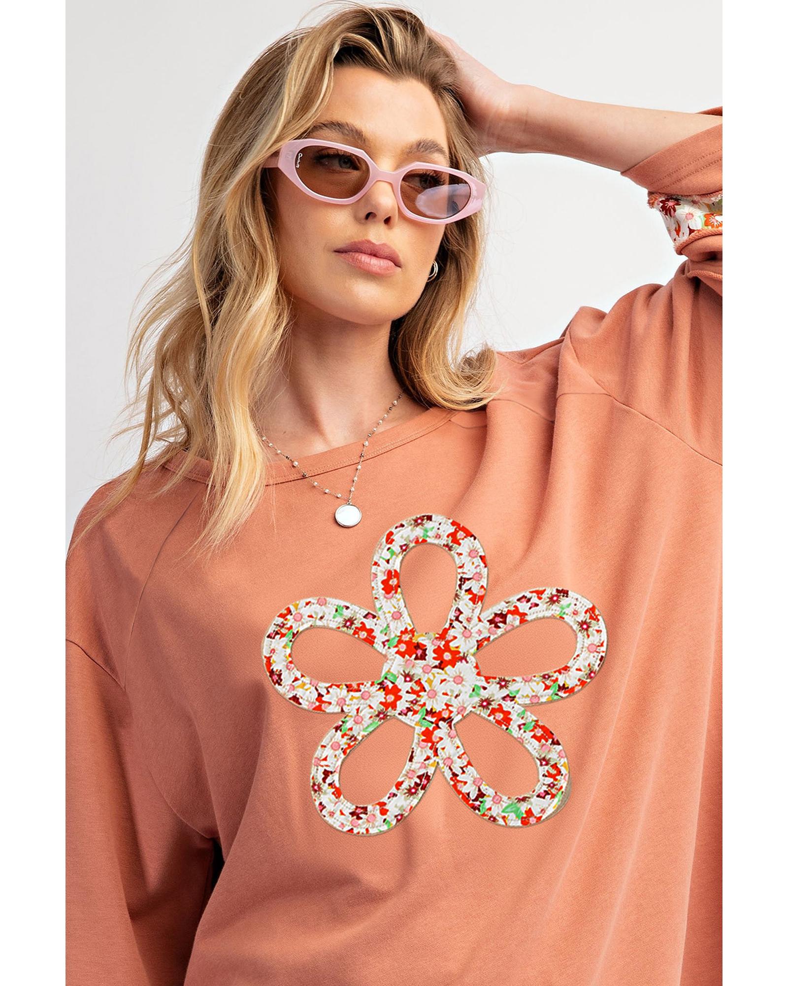 Grapefruit Orange Flower Patch Graphic Exposed Seam Wide Sleeve Top – S