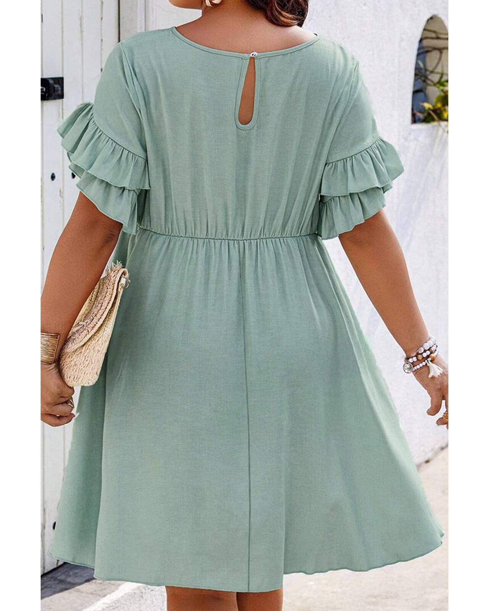- Grass green ruffle trim short sleeve plus size flared mini dress