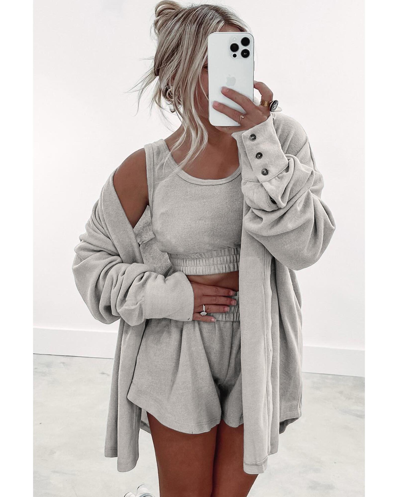 Gray 3 Pcs Crop Tank Top Shorts with Cardigan Lounge Set – XL