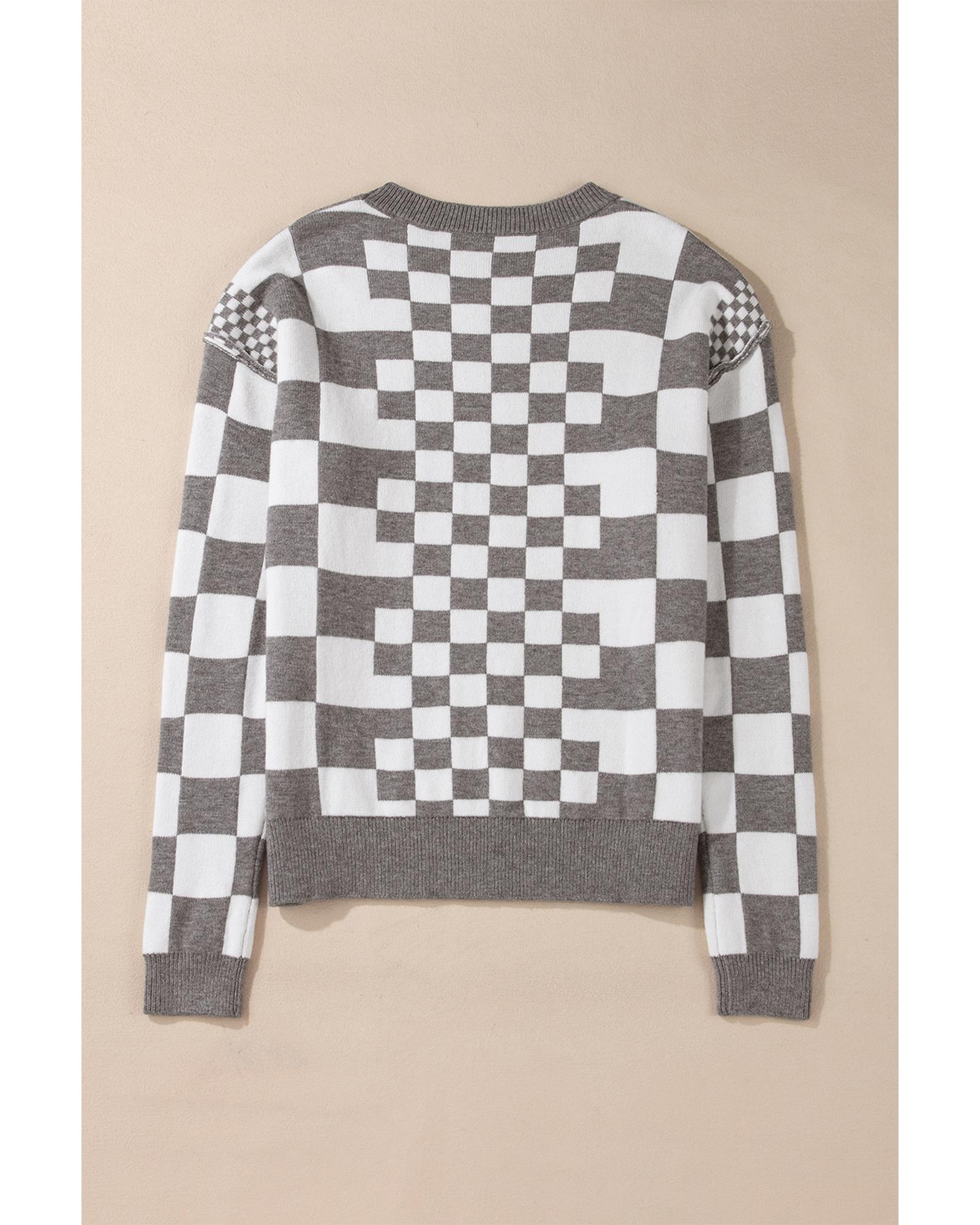 Gray Checkered Print Drop Shoulder Round Neck Sweater – S