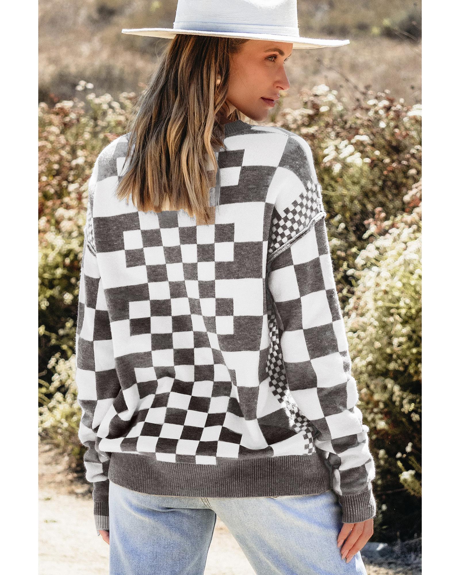 Gray Checkered Print Drop Shoulder Round Neck Sweater – XL
