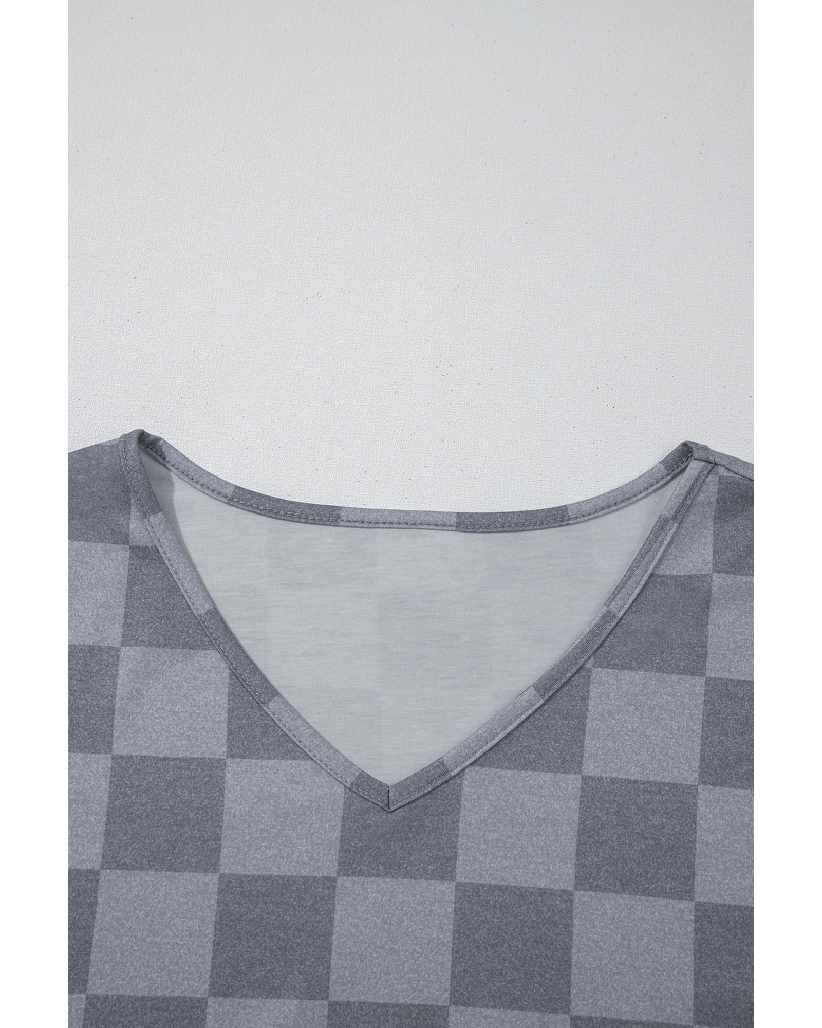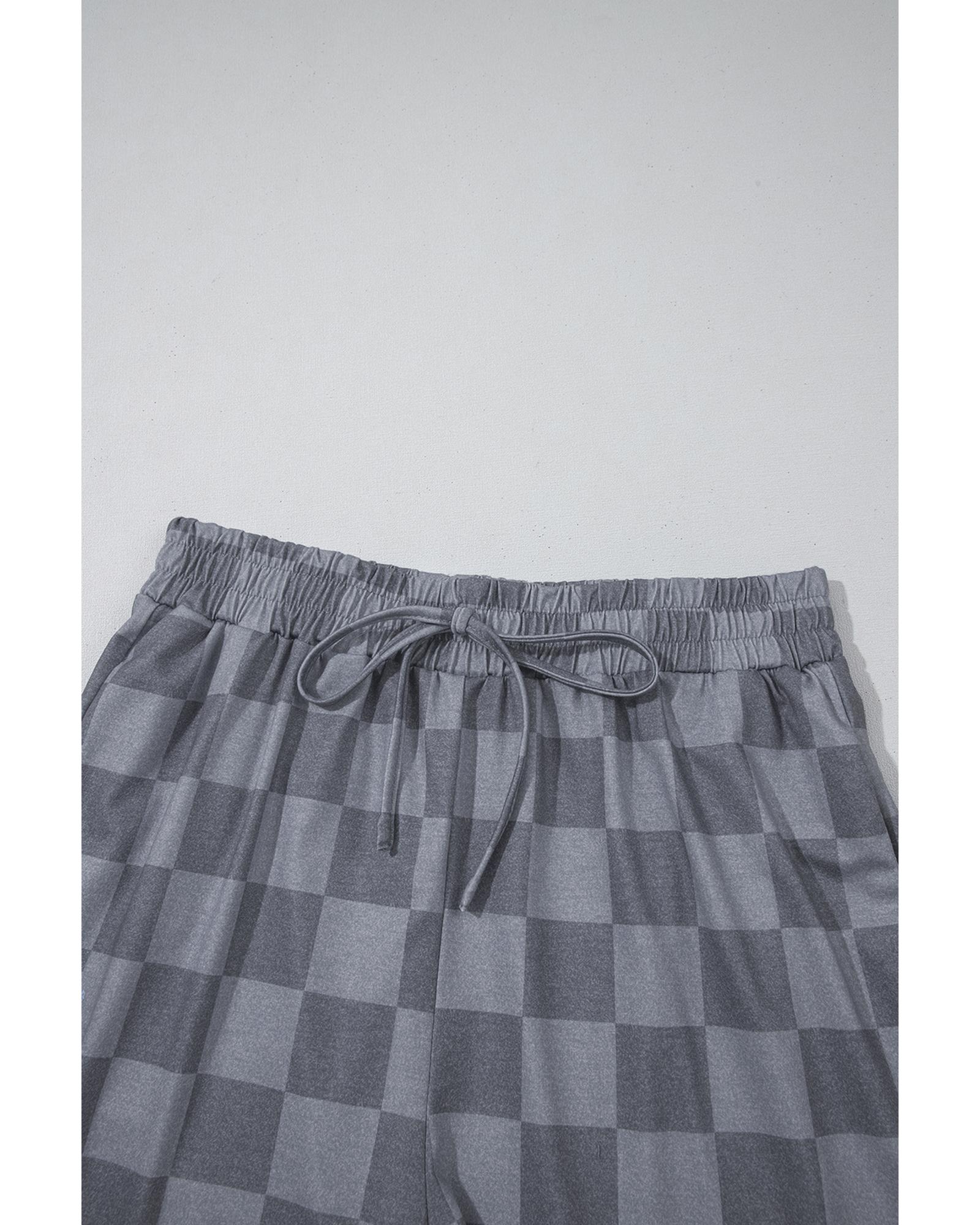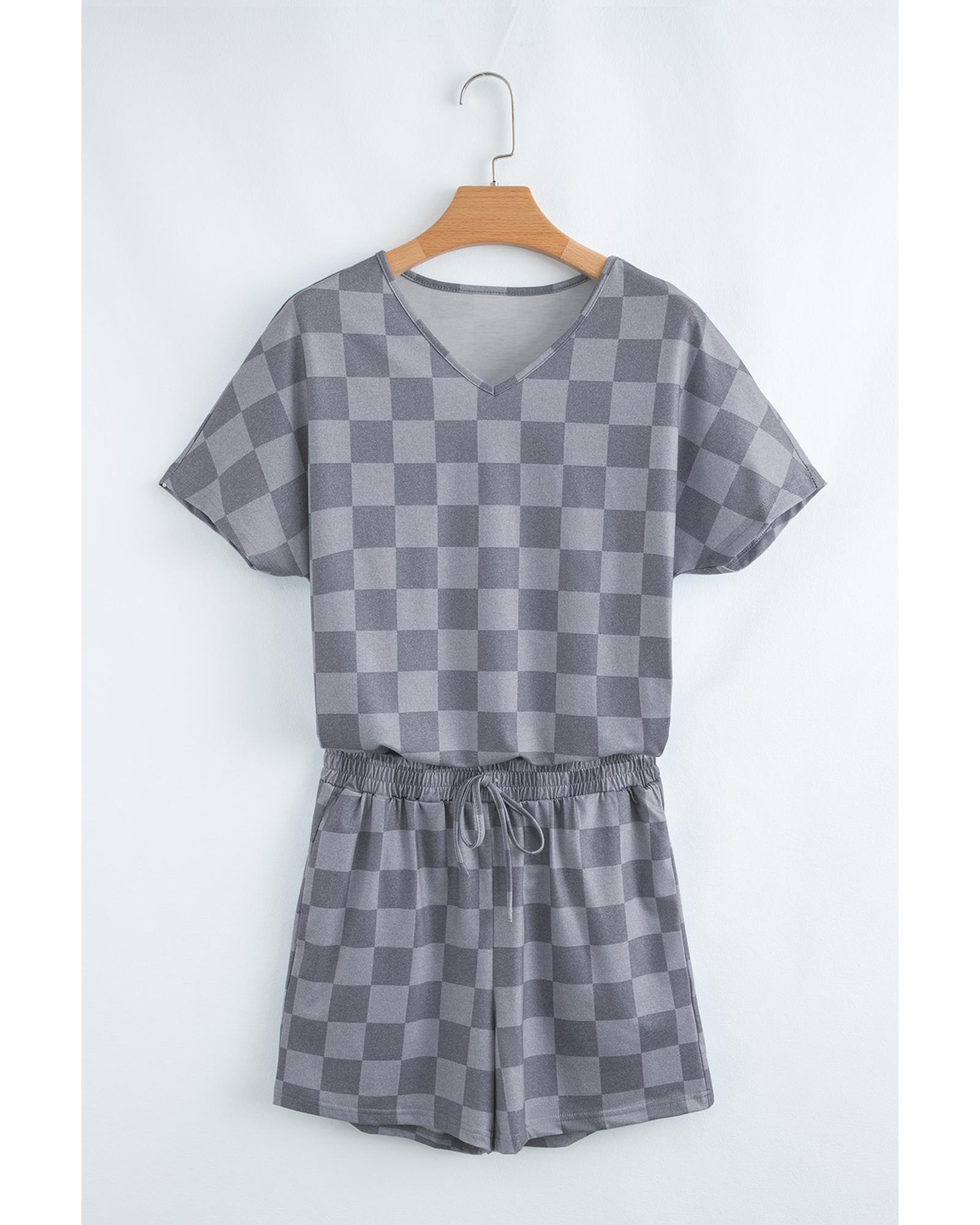 Gray Checkered V Neck Tee Drawstring Shorts Lounge Set – M