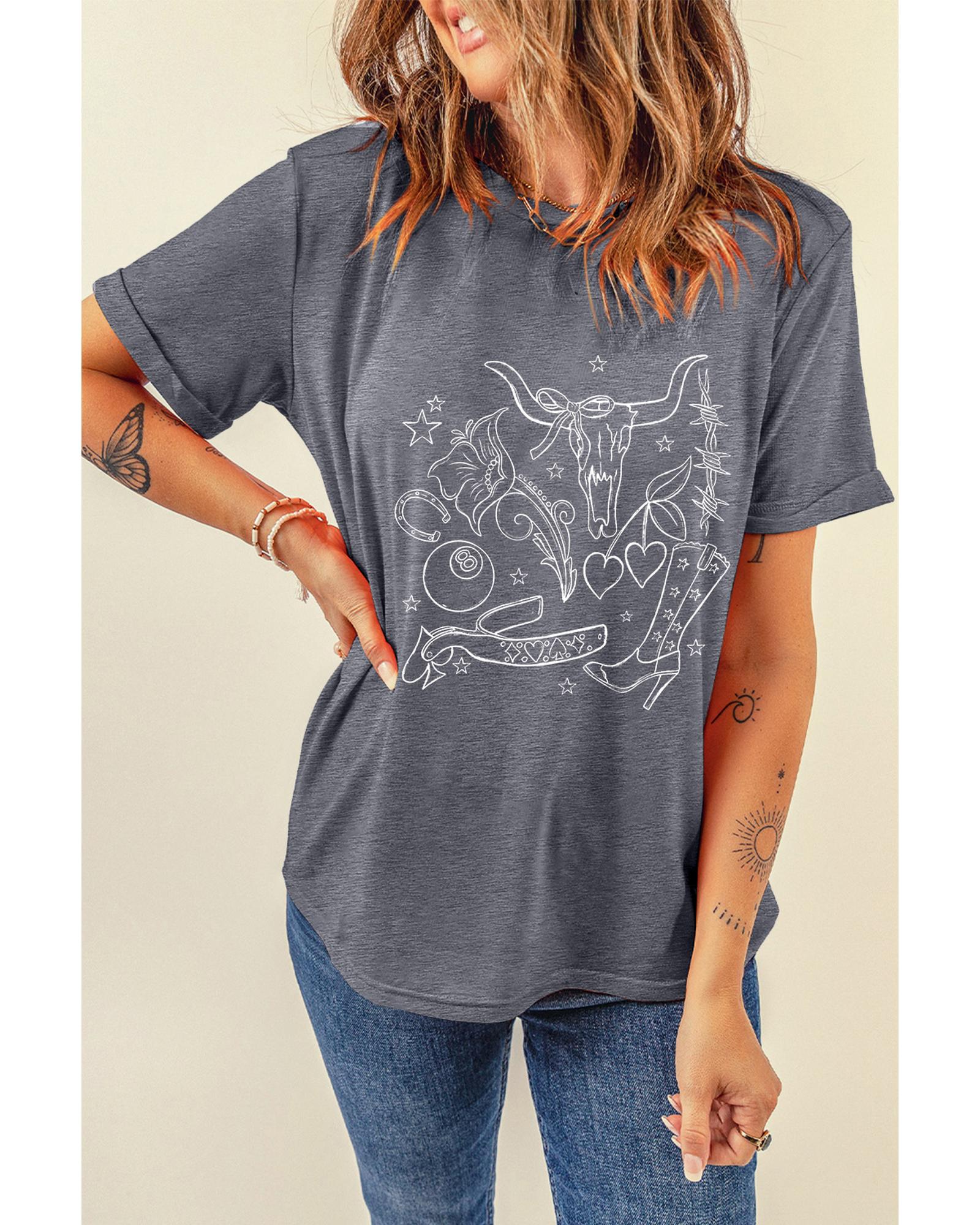Gray Cowgirl Boots OX Head Western Fashion Print Crewneck Tee – 2XL