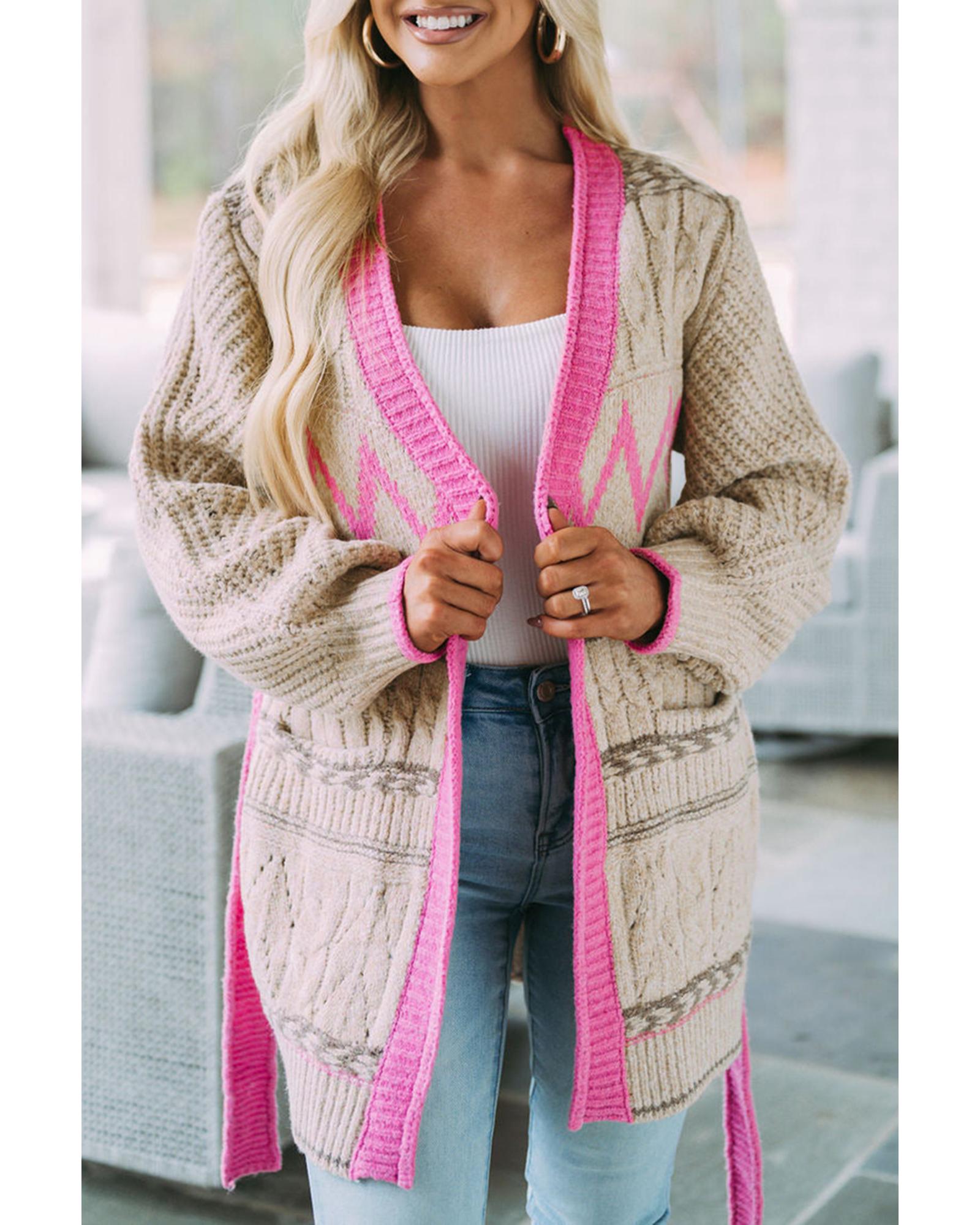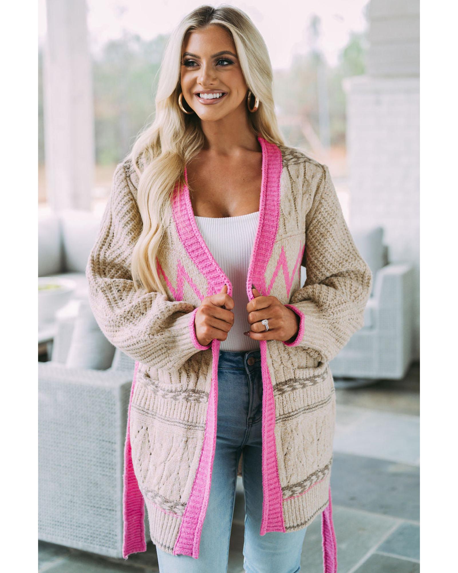 Gray Geometric Cable Knit Pocketed Open Front Cardigan – M
