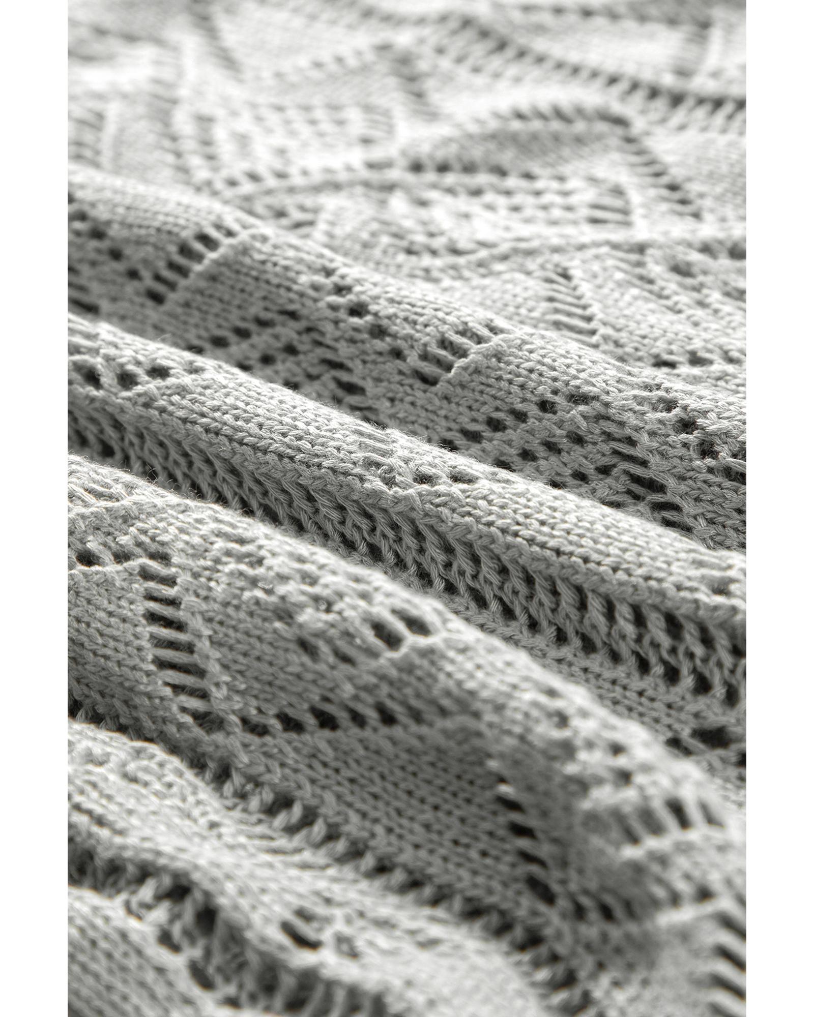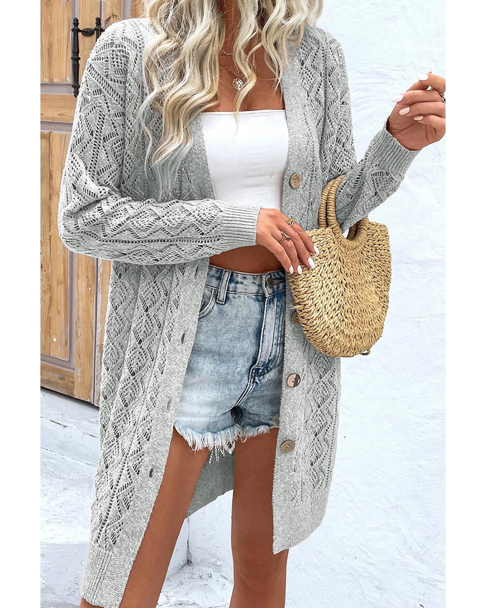 - Gray long cardigan with intricate knit hollow out details