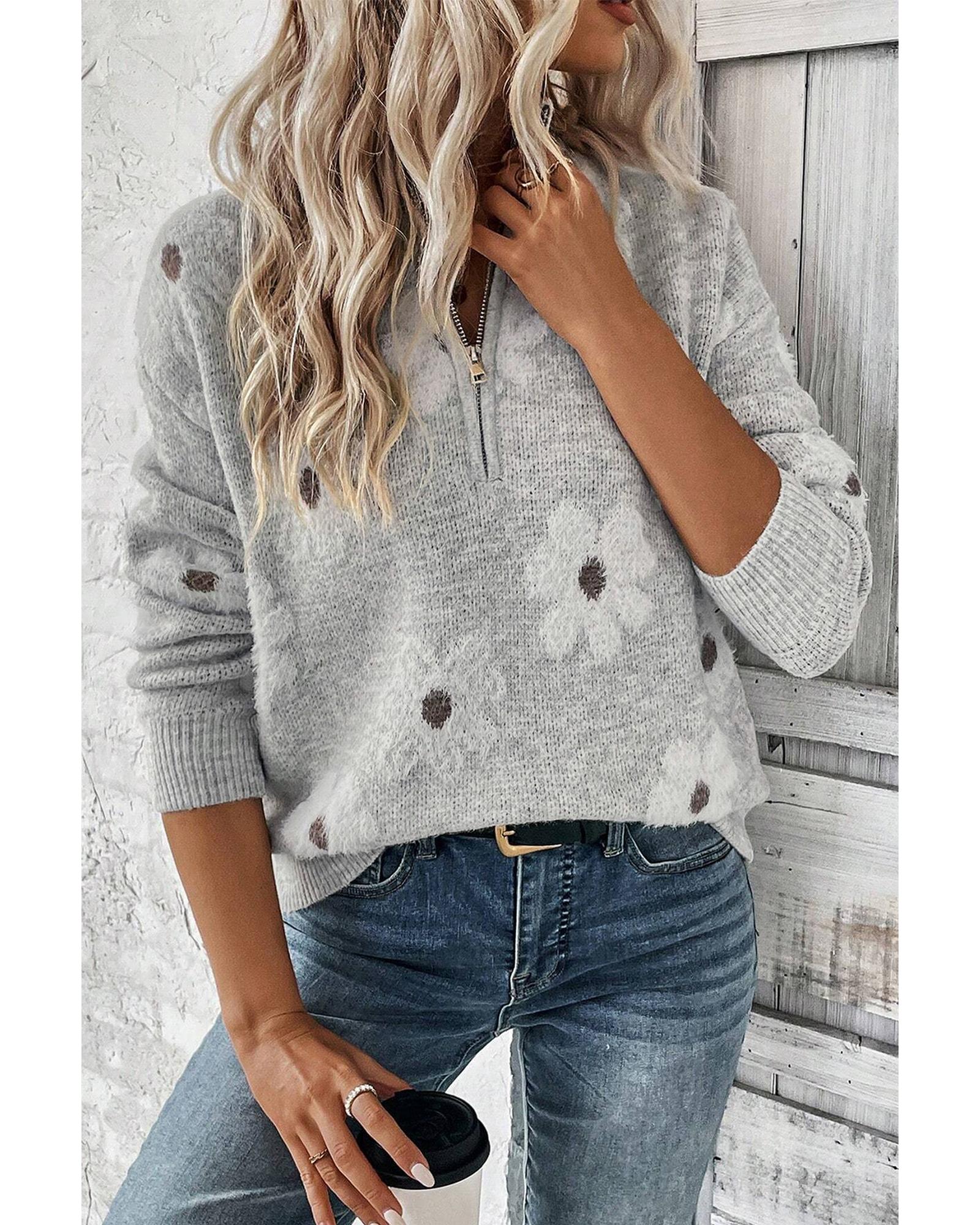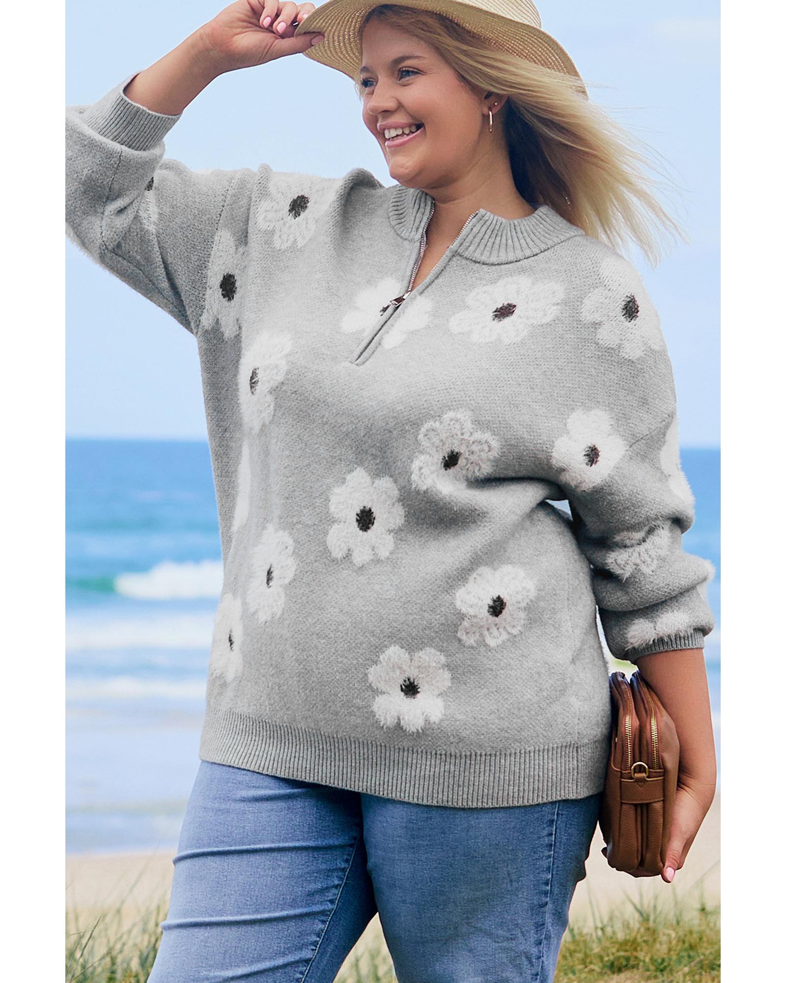 Gray Plus Size Embroidered Floral Pattern Half Zip Sweater – 1X