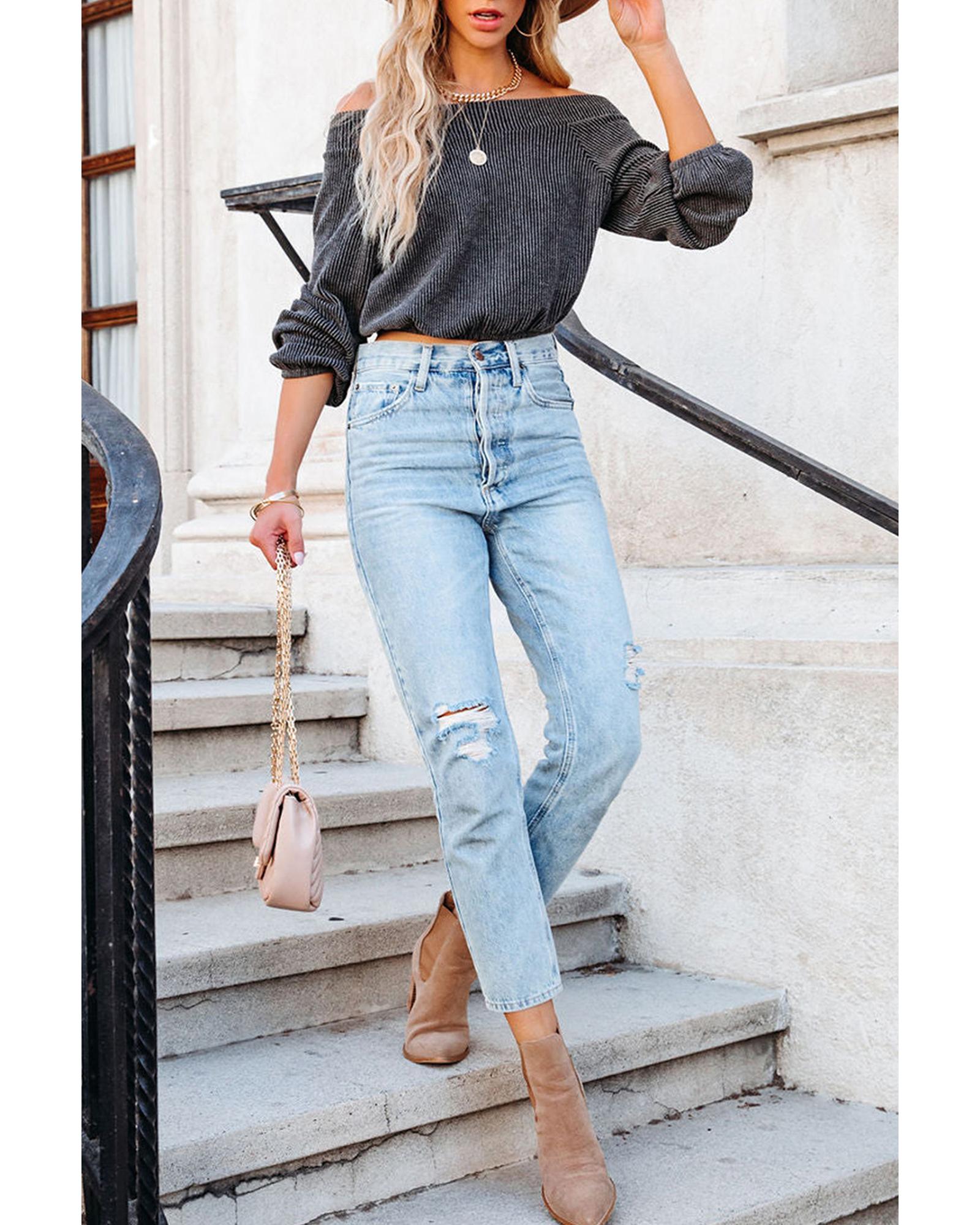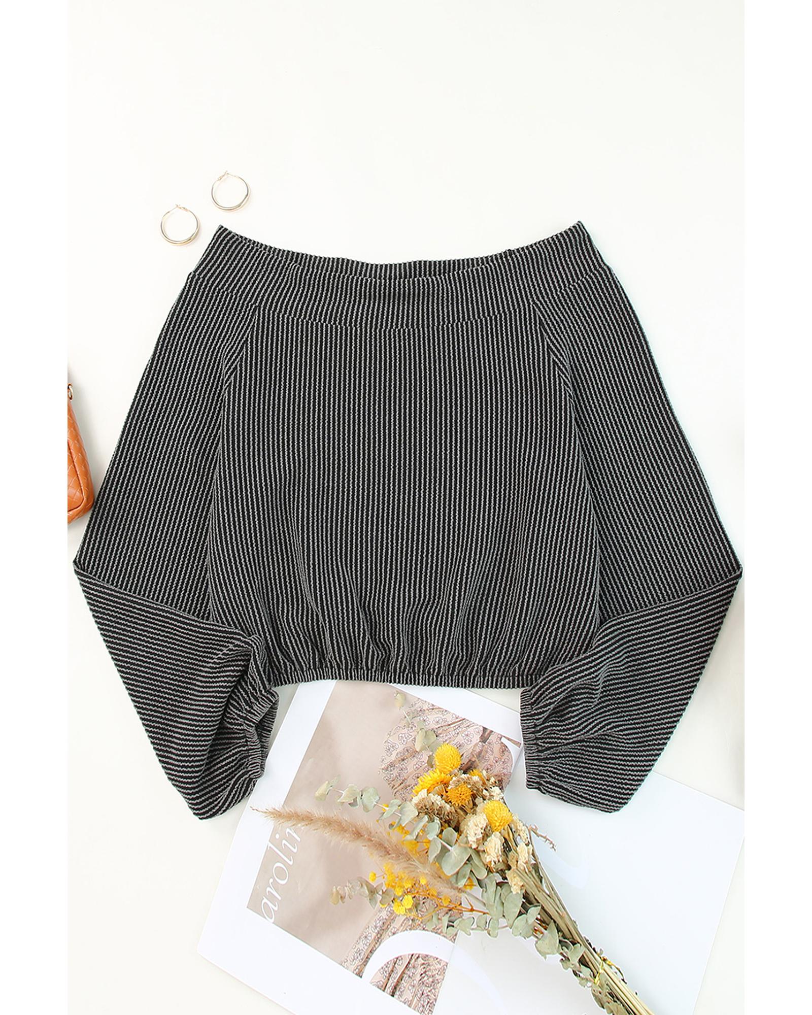 Gray Ribbed Knit Off-Shoulder Balloon Sleeve Top – L