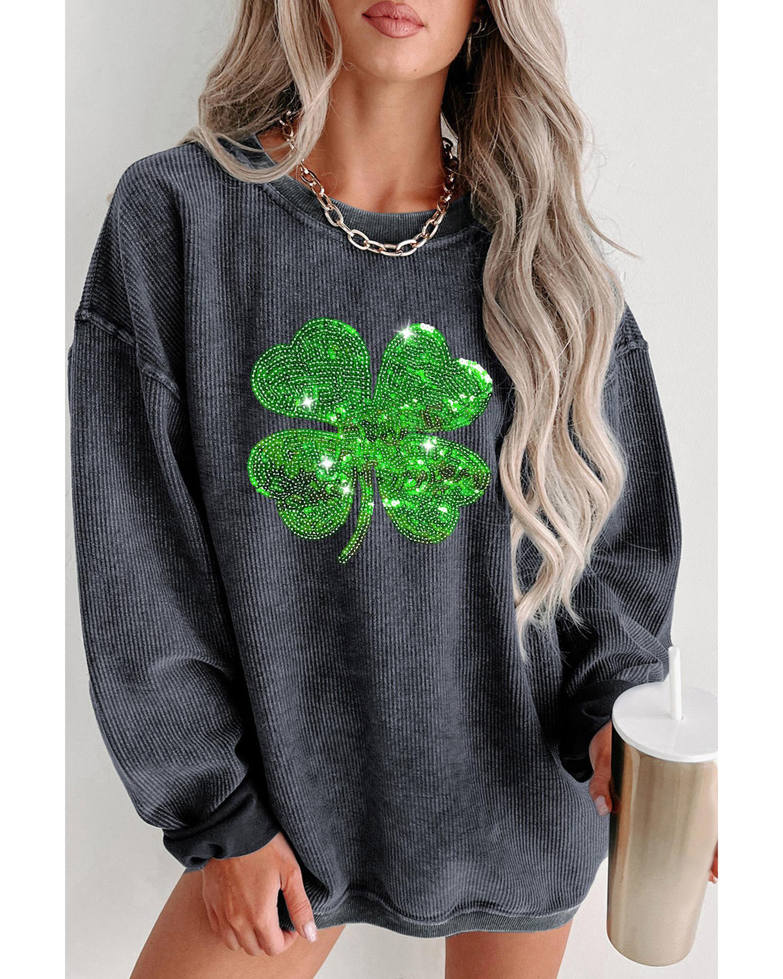 • Gray Sequin St Patrick Clover Patch Corded Sweatshirt