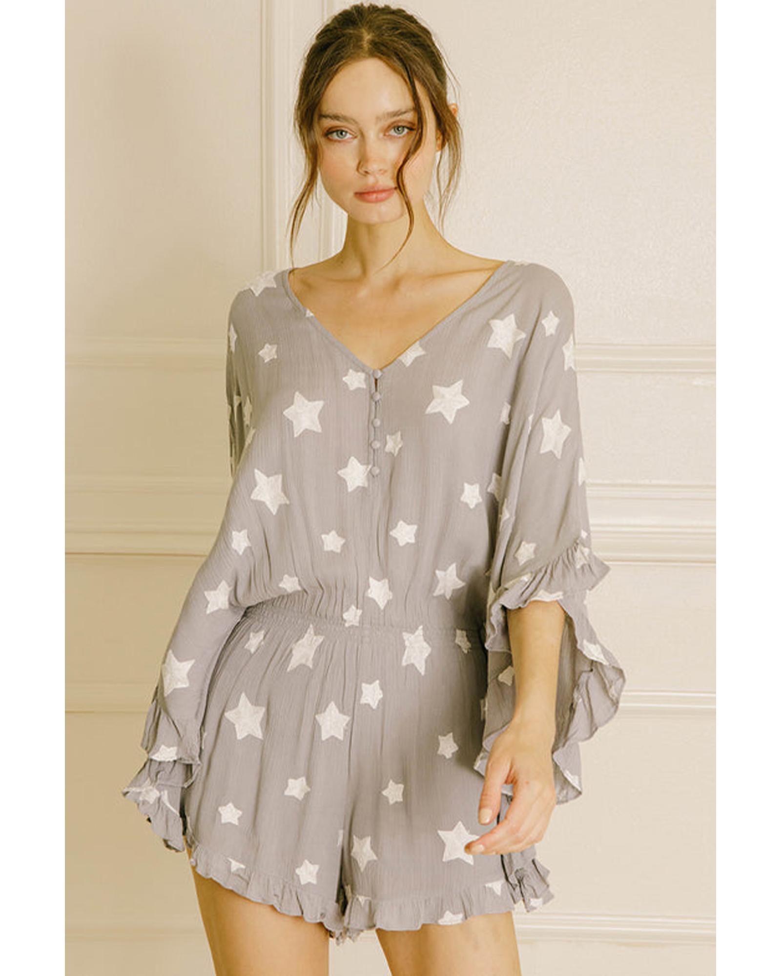 Gray Star Print Crinkle Textured Kimono Ruffle Sleeve Romper – S