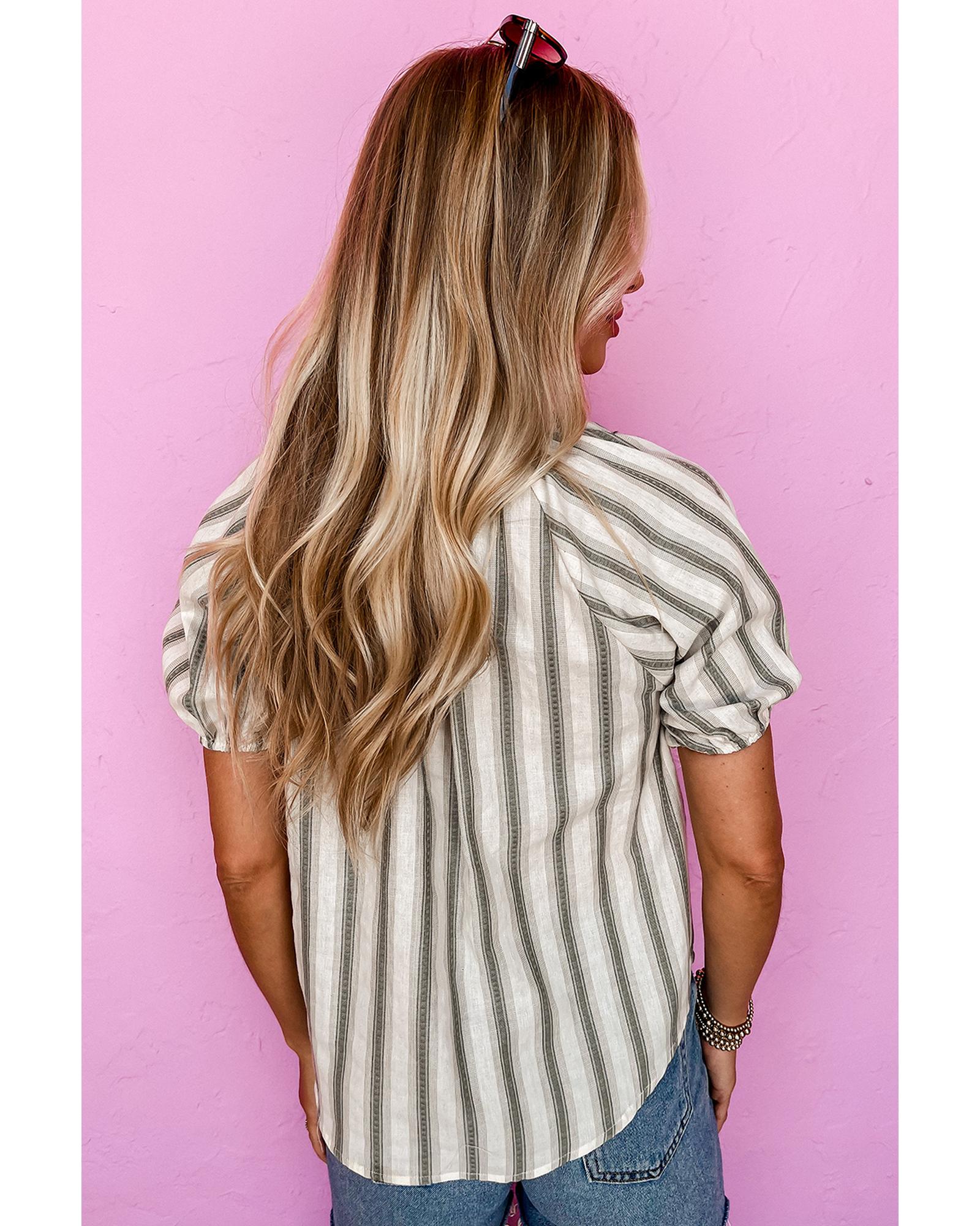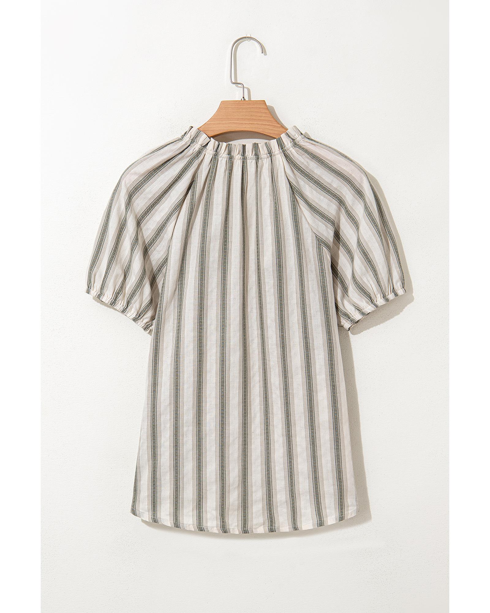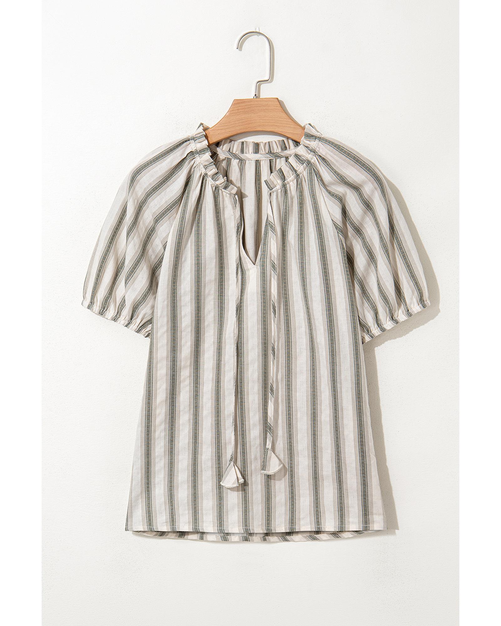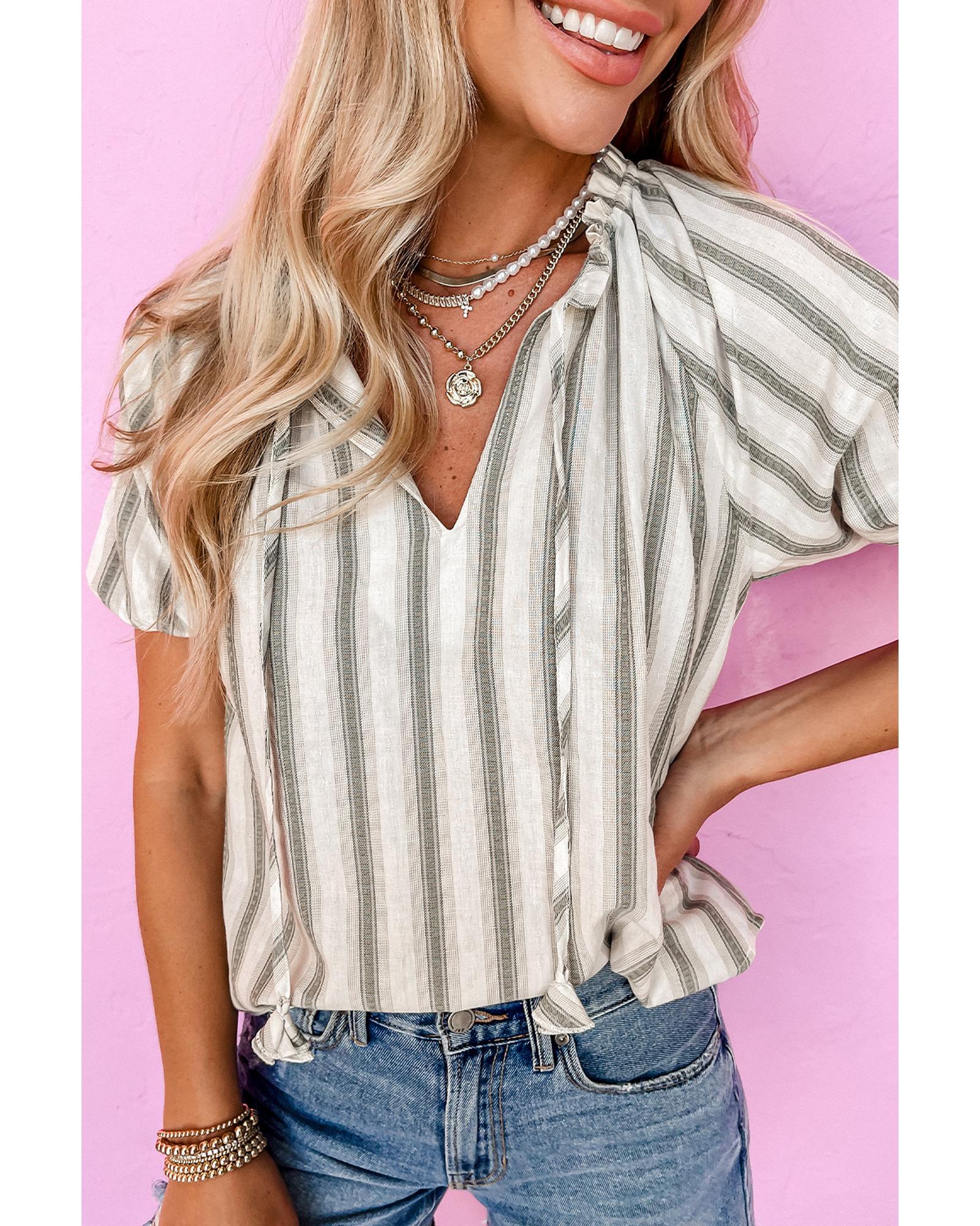Gray Stripe Frilled Tie Neck Short Sleeve Blouse – S