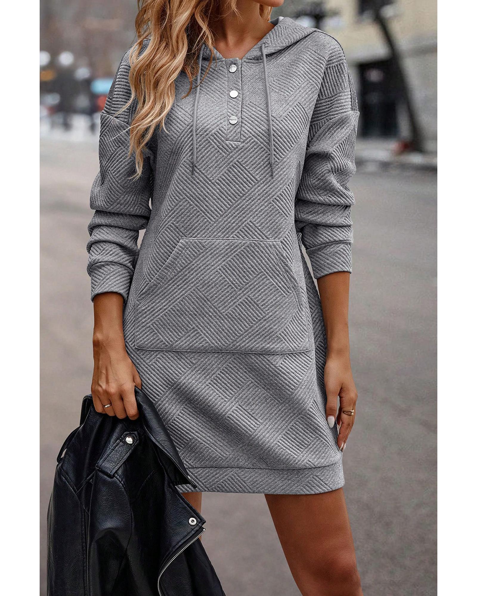 Gray Textured Kangaroo Pocket Drawstring Hooded Mini Dress – S