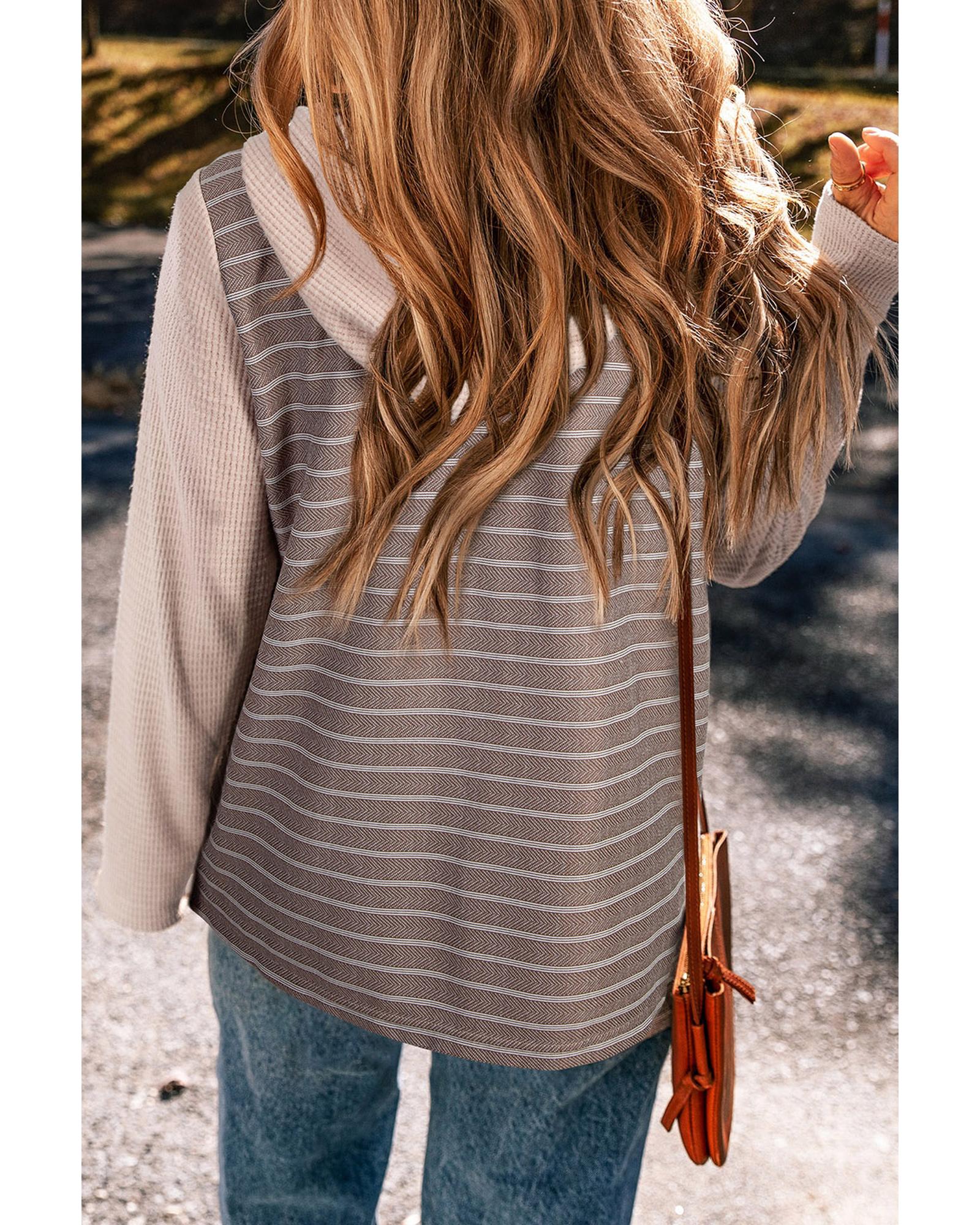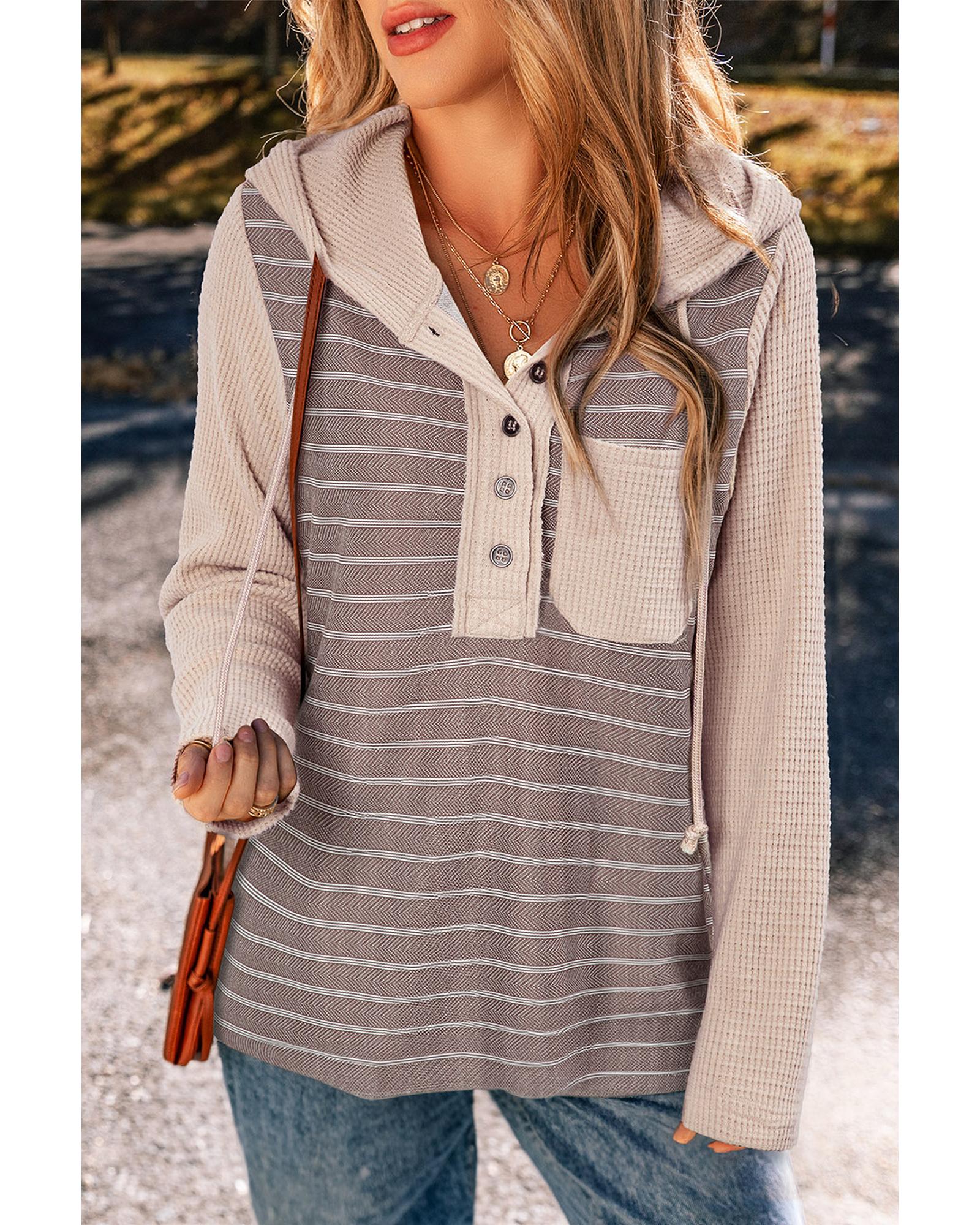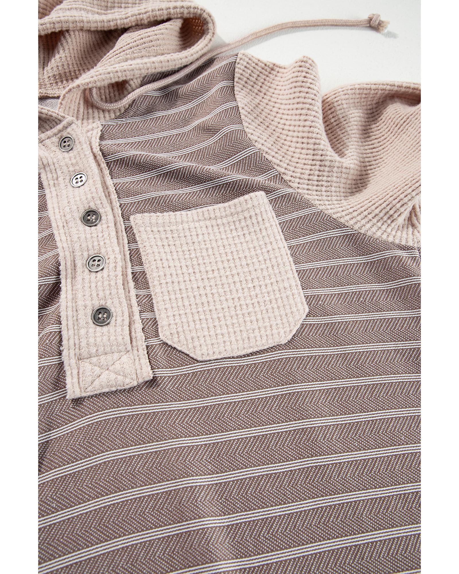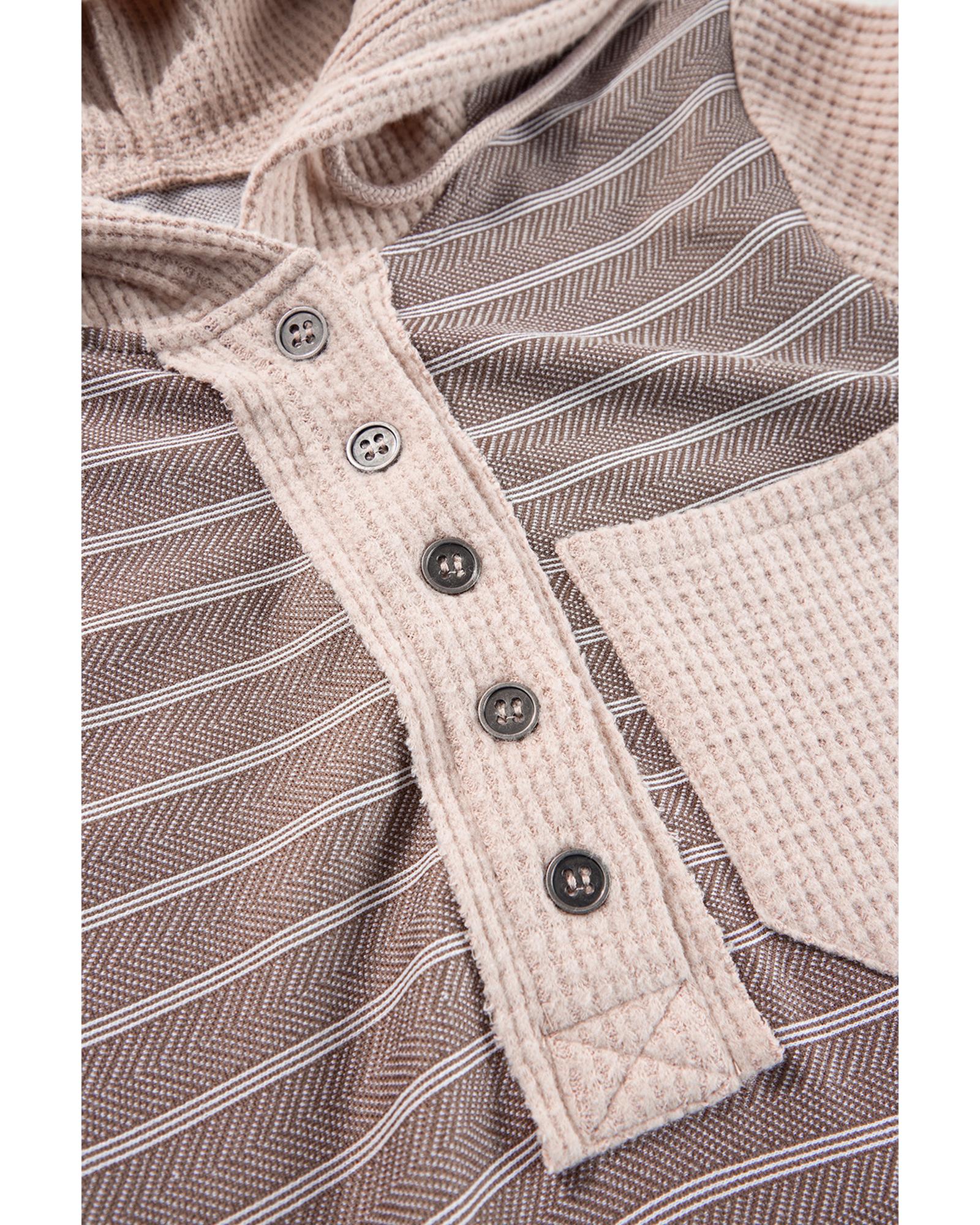 Gray Textured Knit Colorblock Striped Henley Hooded Top – S