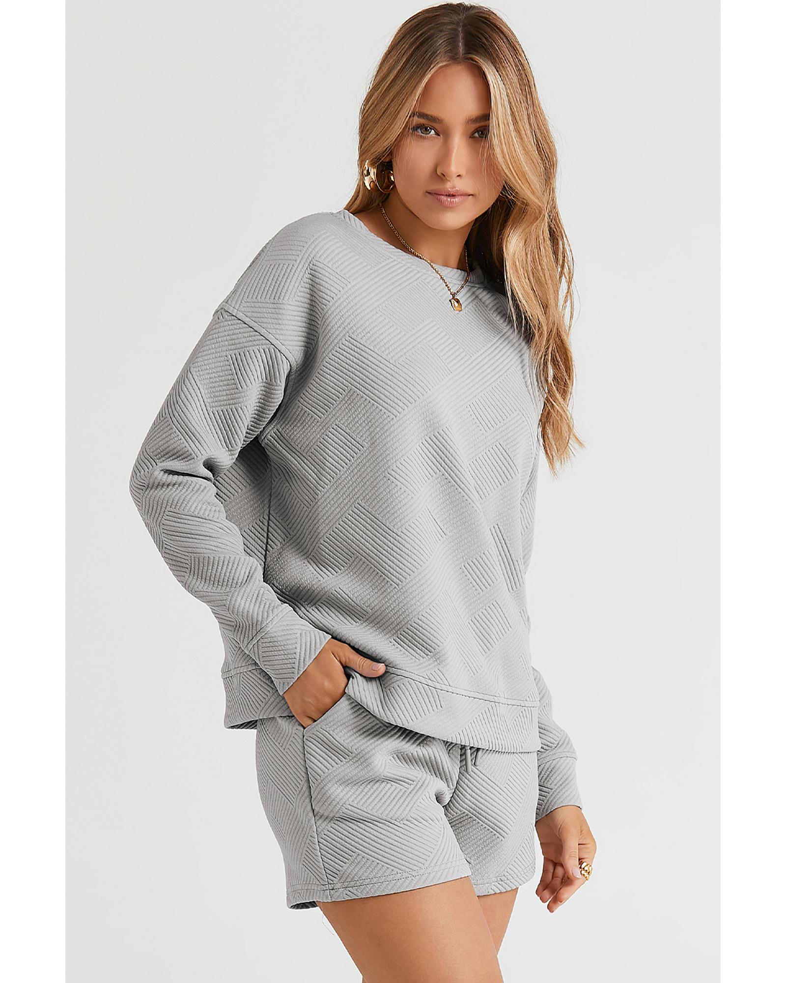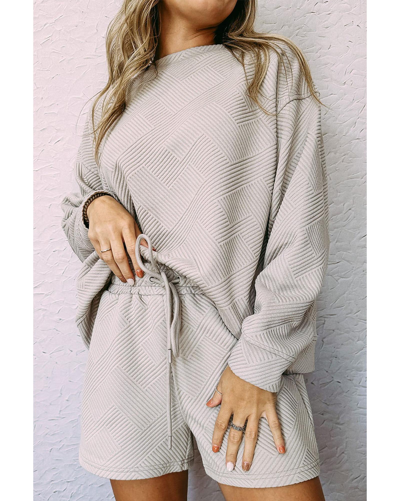 Gray Textured Long Sleeve Top and Drawstring Shorts Set – S