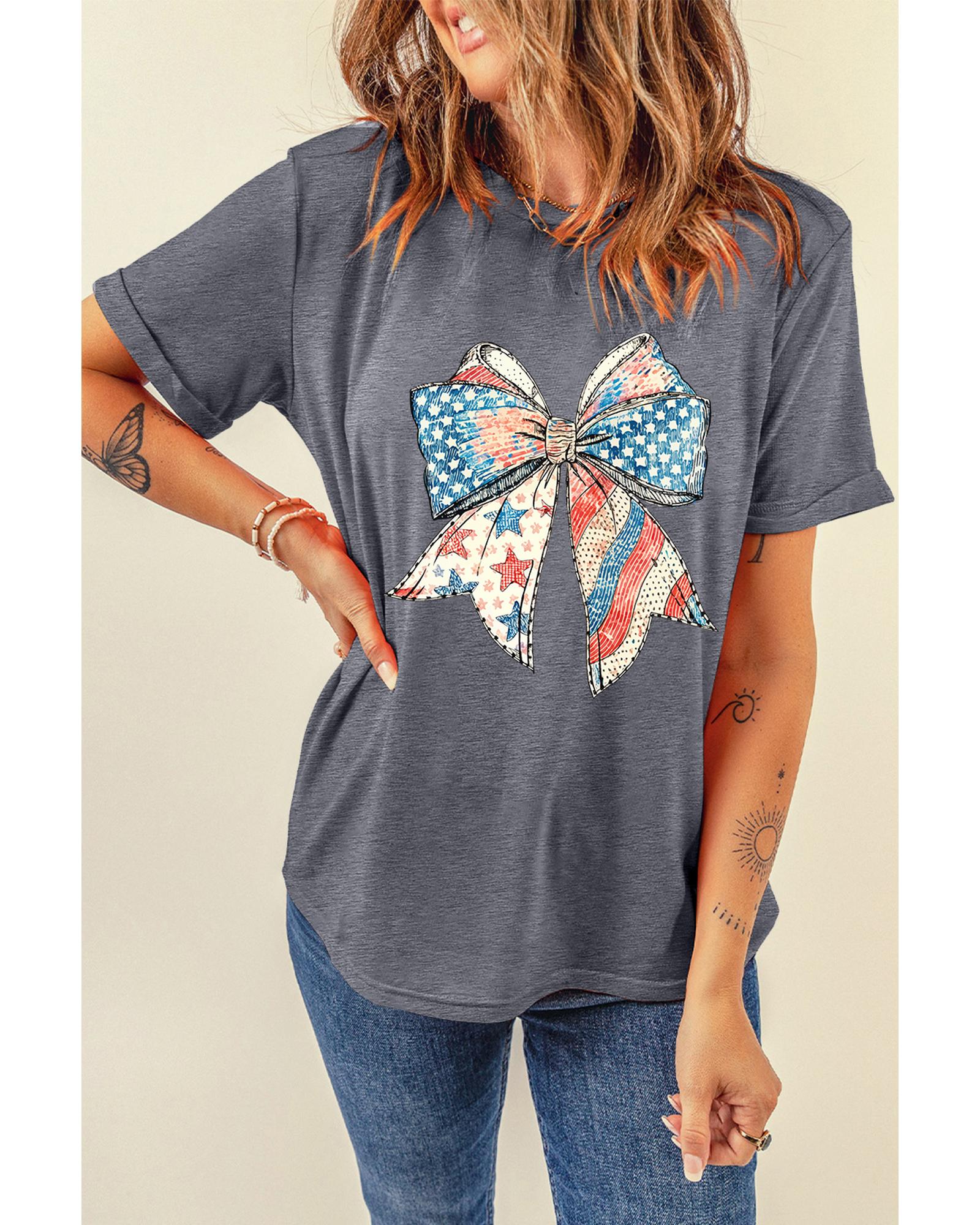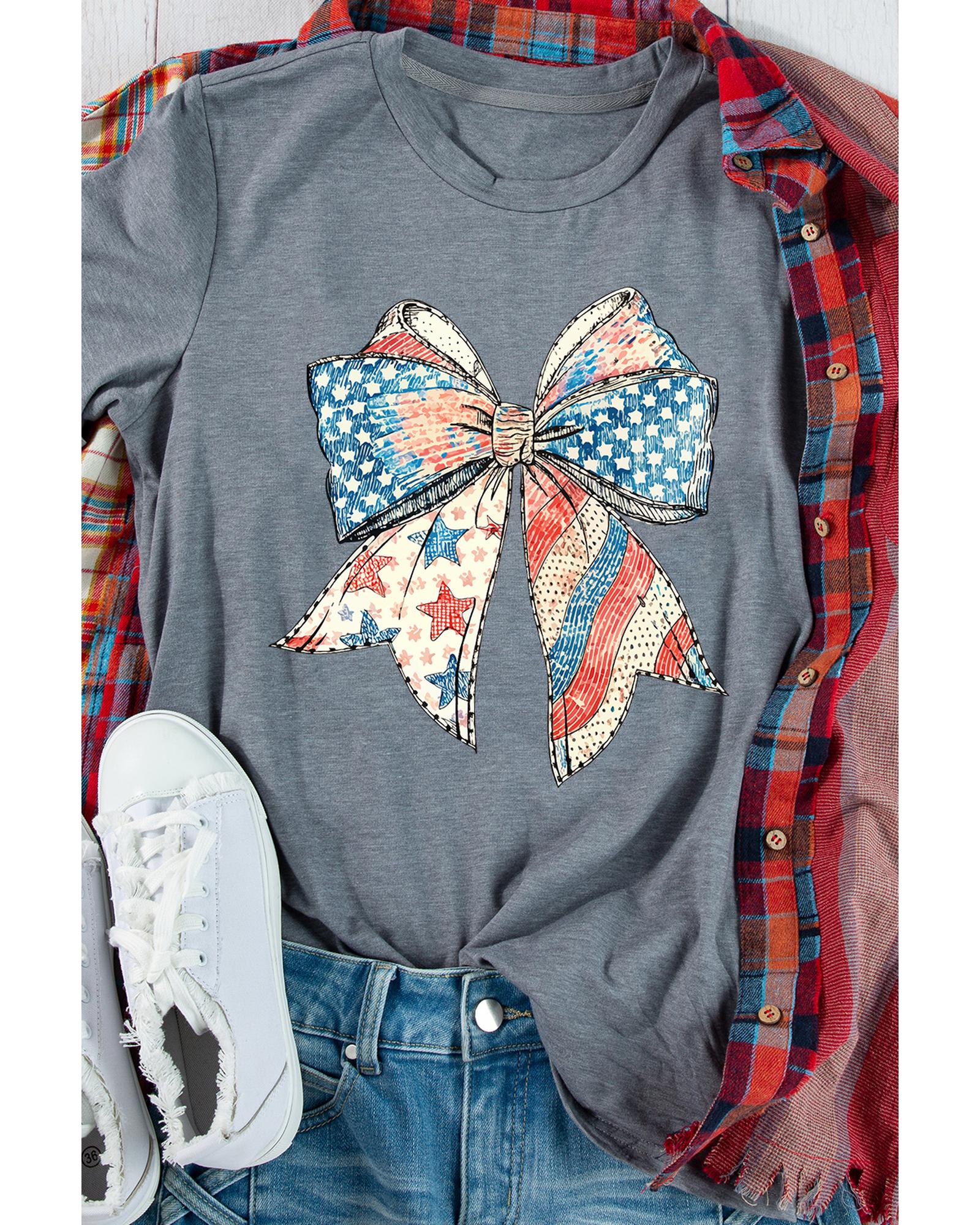Gray US Flag Bow Print Round Neck Loose T Shirt – M
