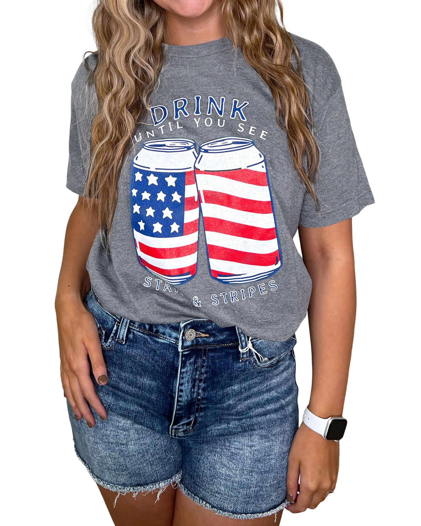 Gray USA Flag Drink Cans Slogan Graphic Tee US flag graphic print on the front Short sleeves for a comfortable fit Available in multiple sizes Refer to the size chart for accurate measurements Made for women - Material: 95% Polyester 5% Elastane