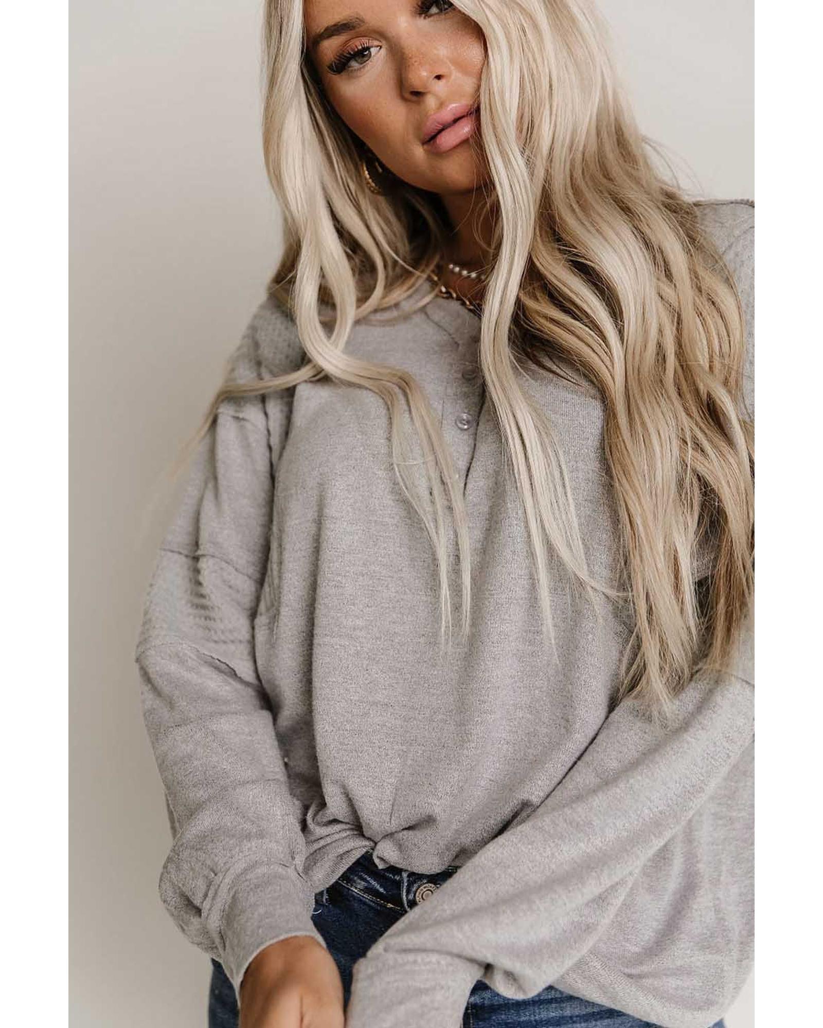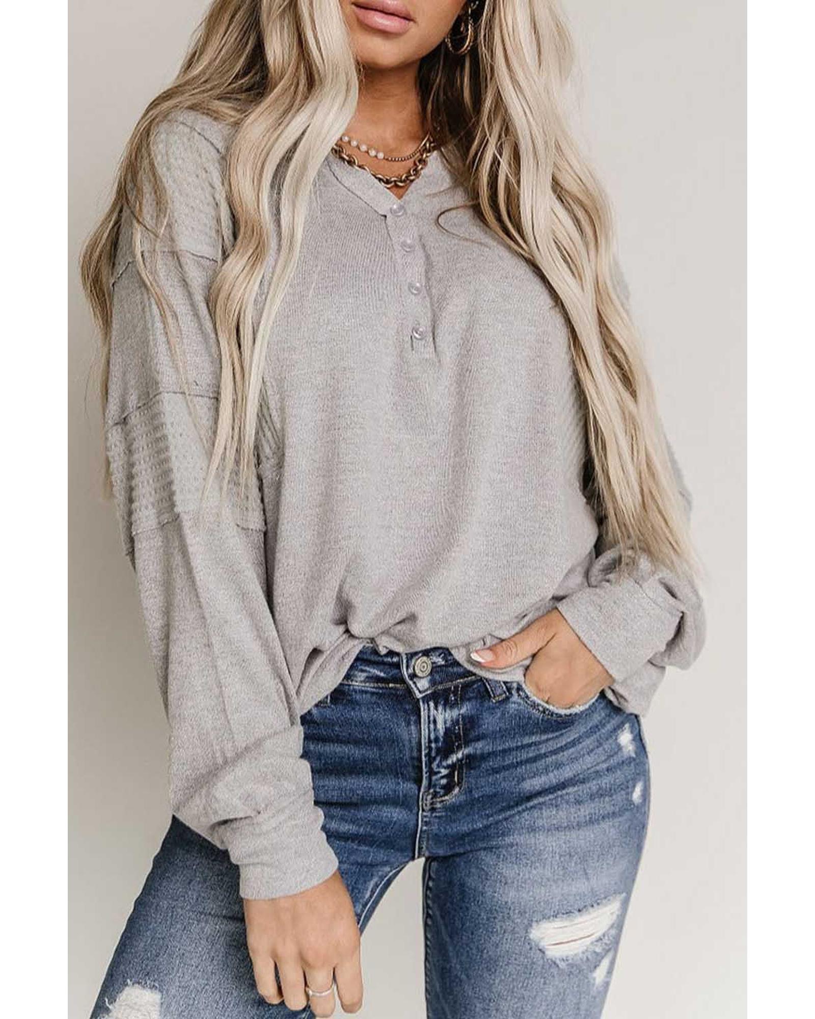 Perfect for casual and relaxed occasions Soft and cozy waffle knit fabric for all - day comfort Buttoned neckline for versatile styling options Unique patchwork sleeves for a trendy and eye