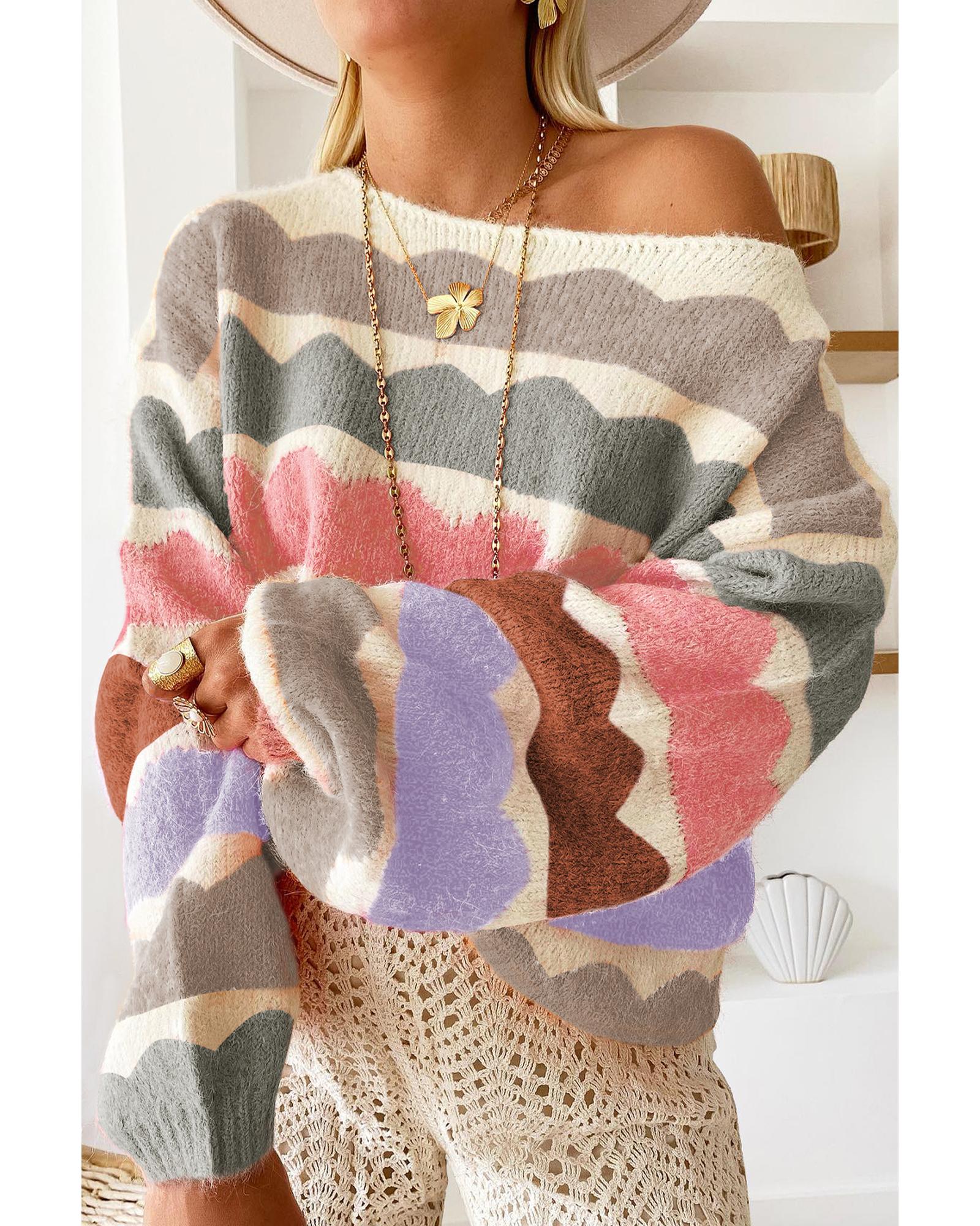 Gray Wave Striped Balloon Sleeve Drop Shoulder Sweater – L