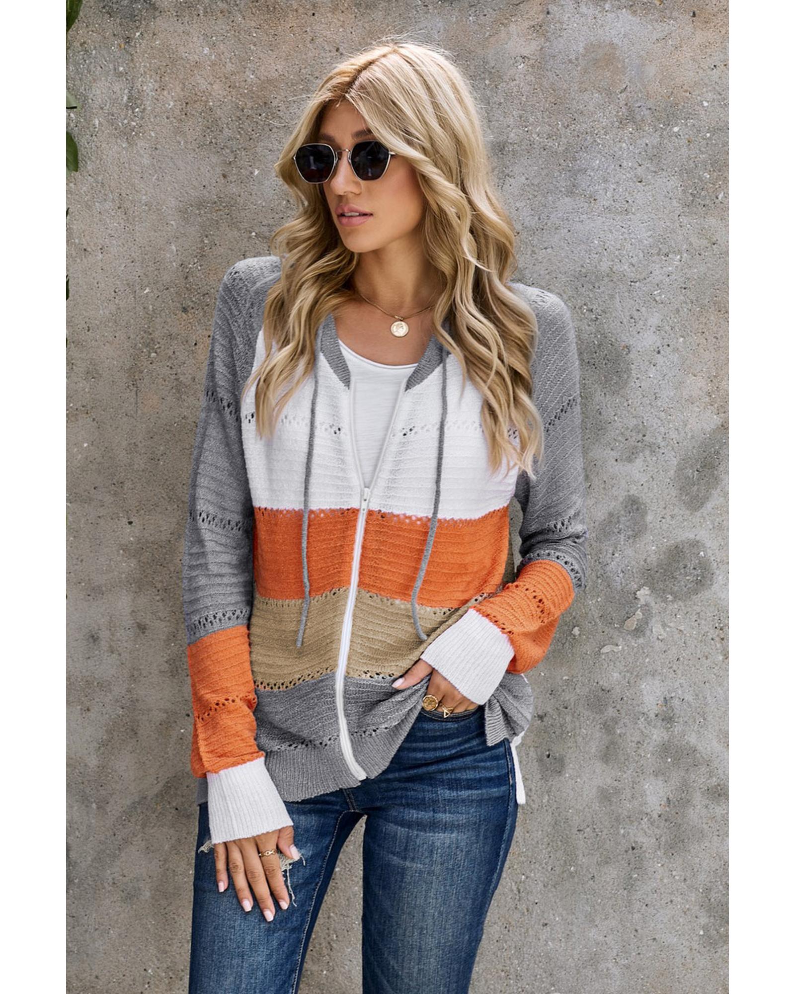 Gray Zipped Front Colorblock Hollow-out Knit Hoodie – L