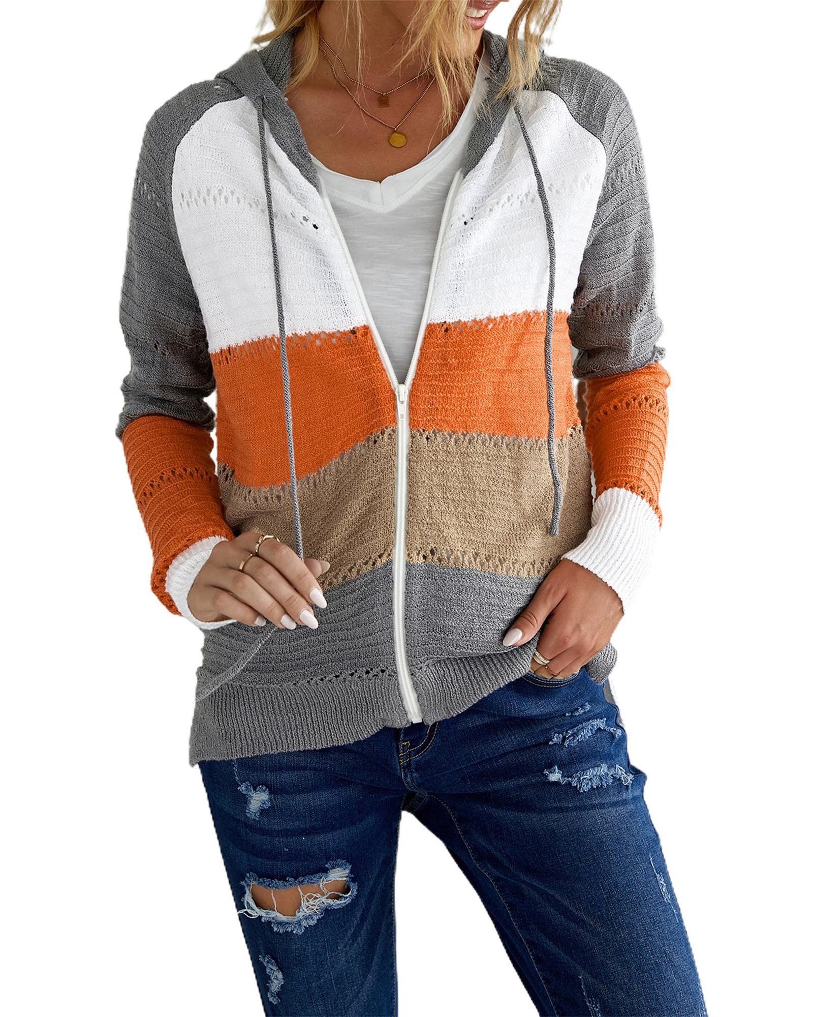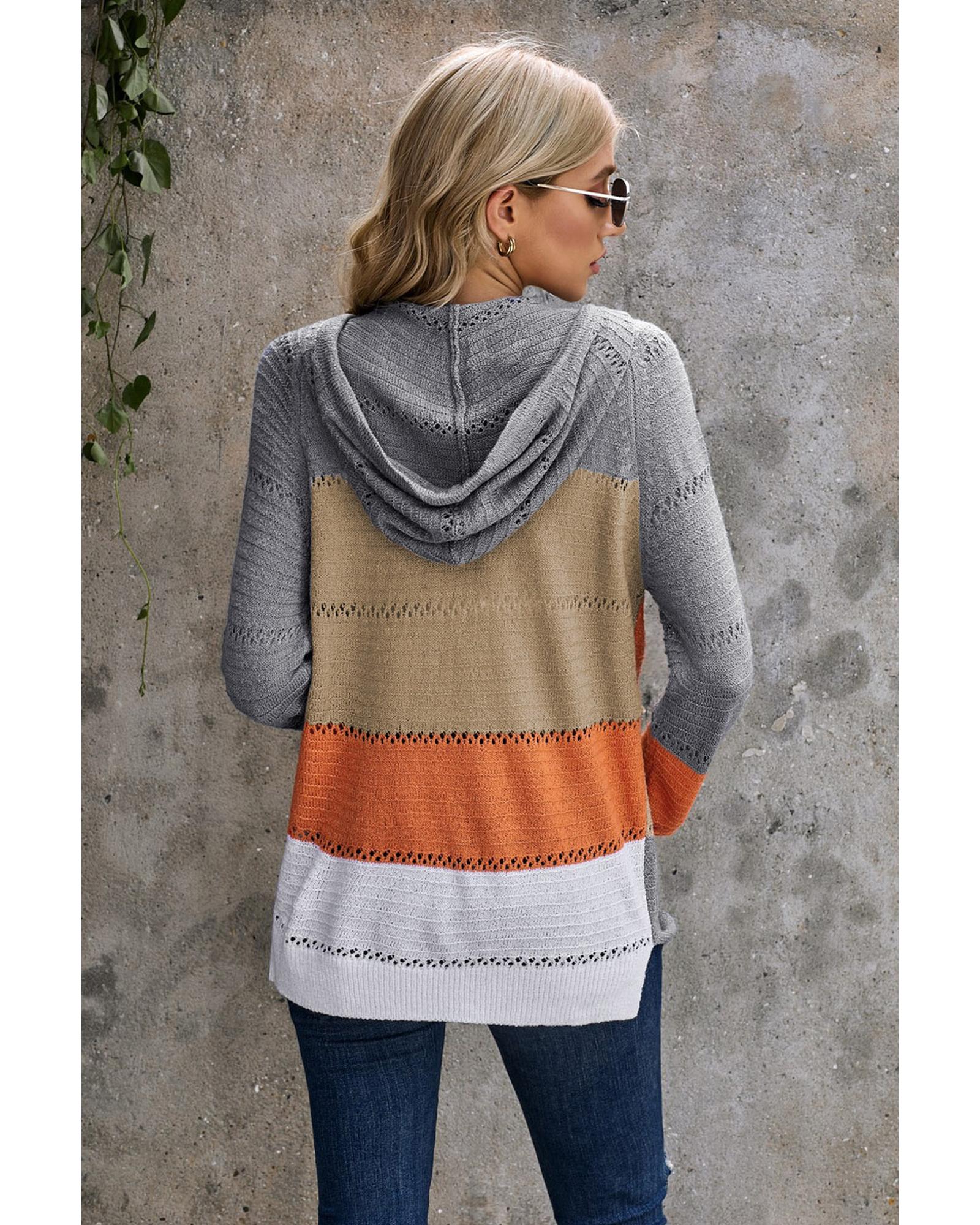 Gray Zipped Front Colorblock Hollow-out Knit Hoodie – S