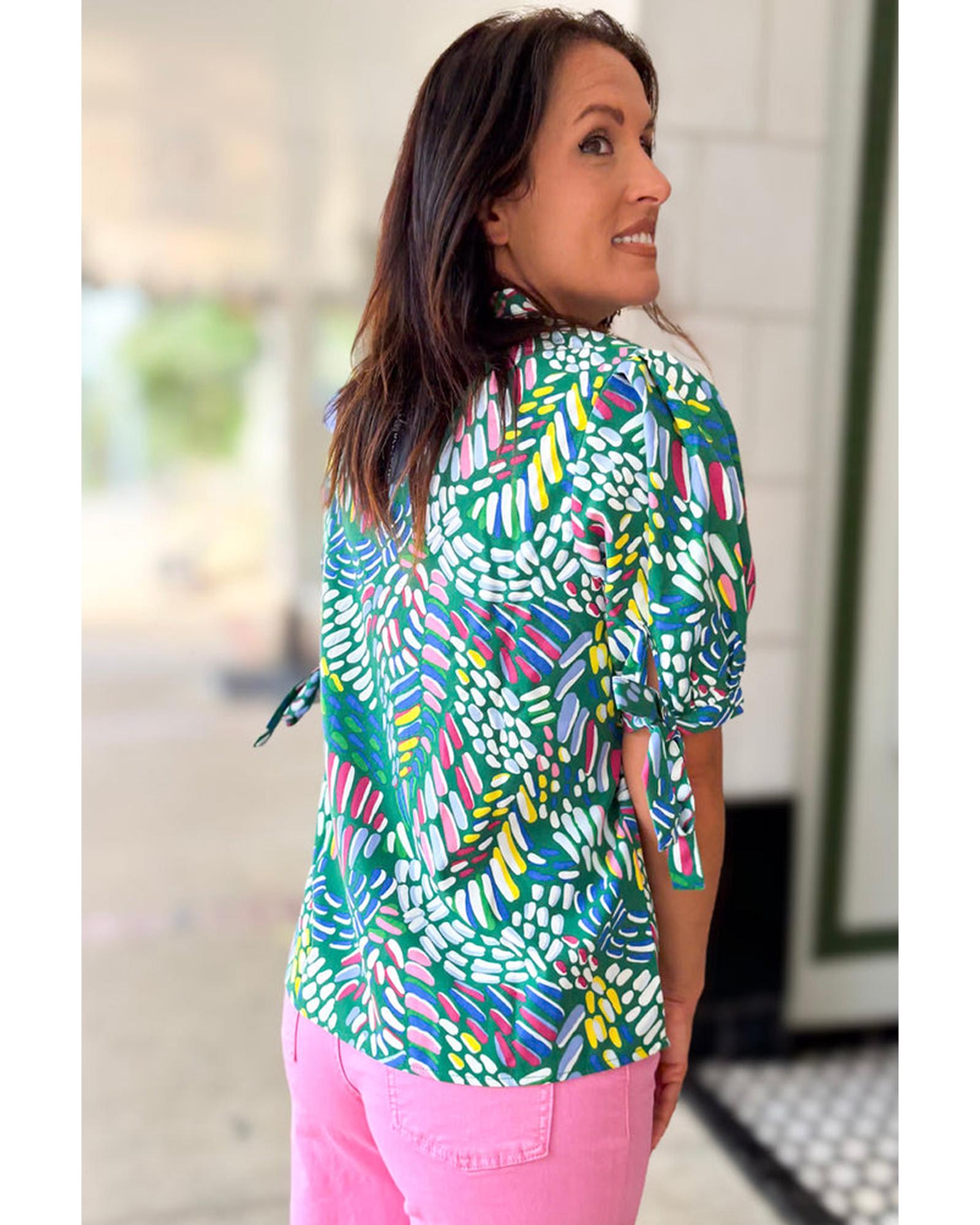 Green Abstract Print Knotted Short Sleeve Plus Size Blouse – 1X