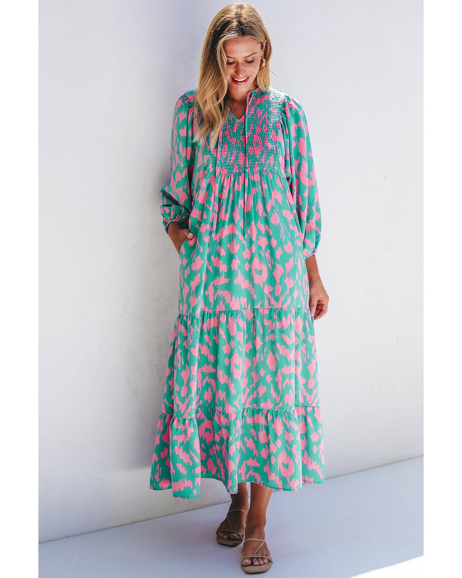 Green Abstract Print Puff Sleeve Tied Notched Neck Long Dress – M