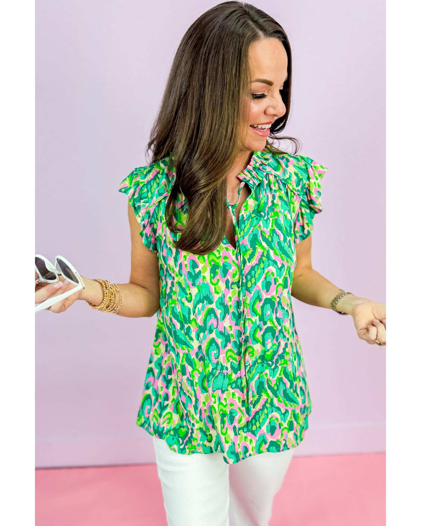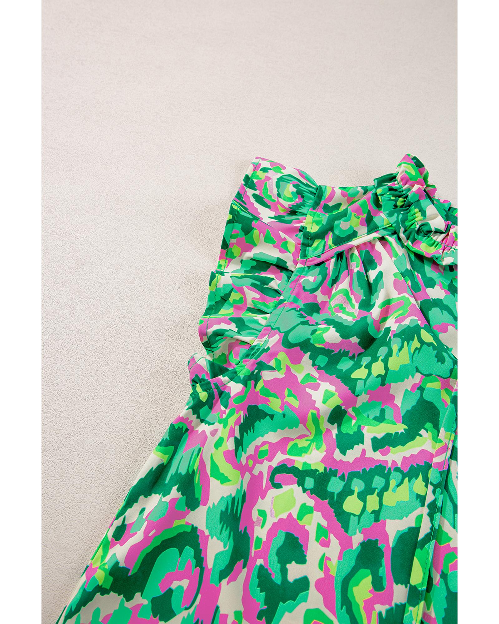 Green Abstract Print Ruffled Trim Tied Split Neck Tank Top – S