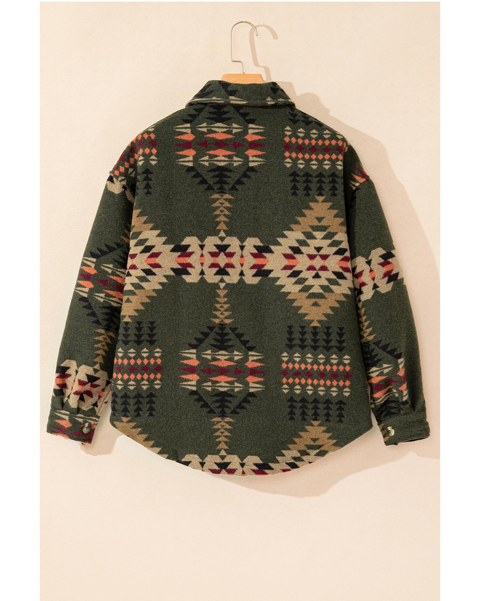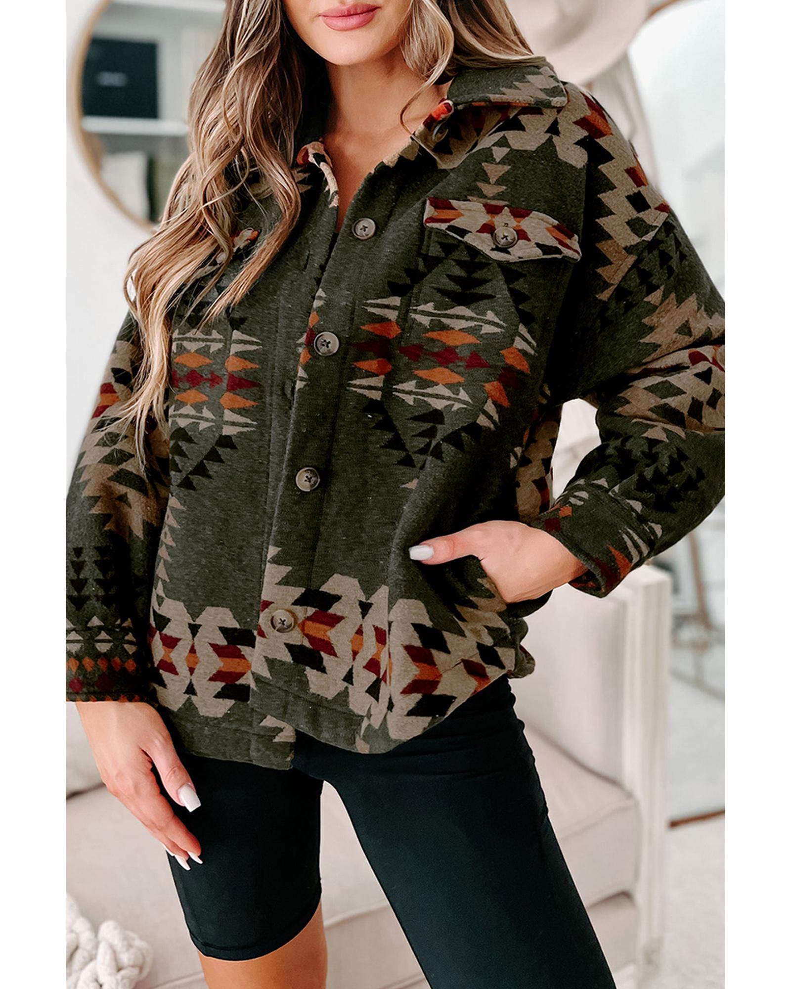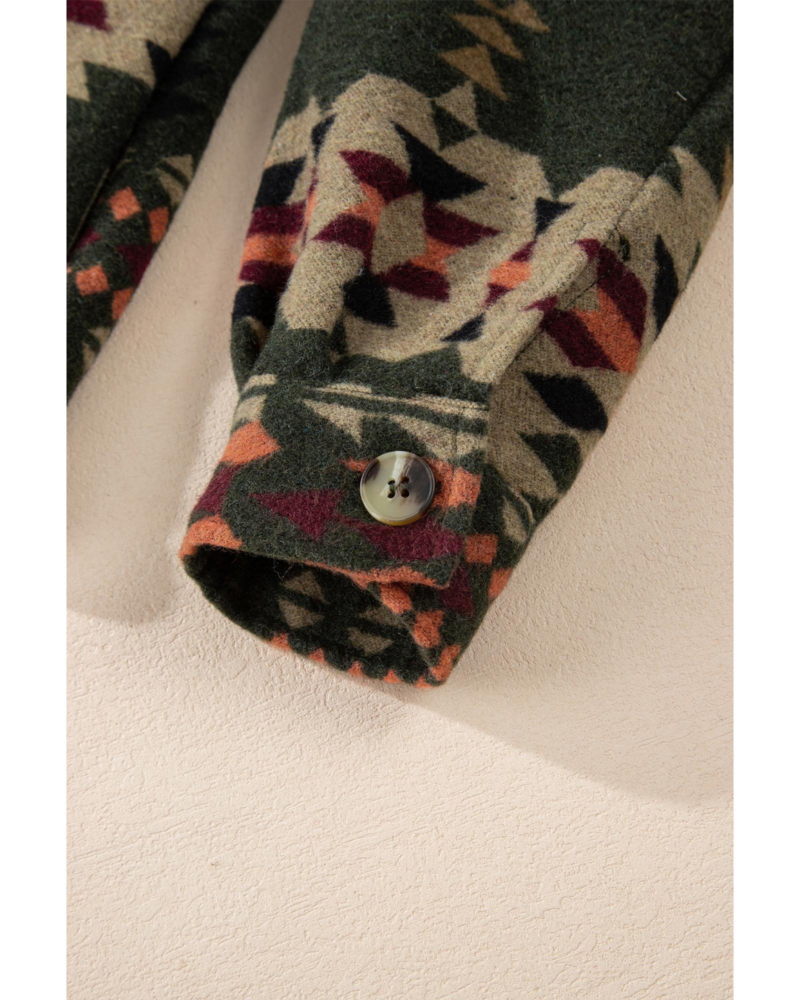- Green Aztec Print Flap Pockets Long Sleeve Shacket