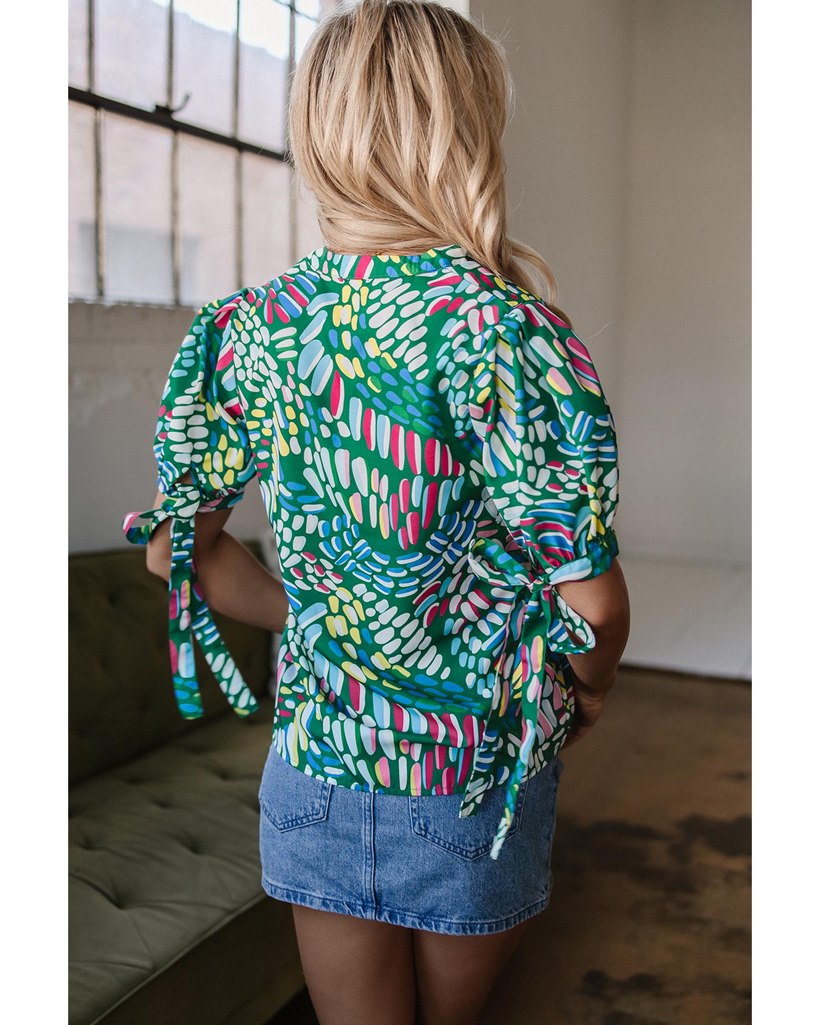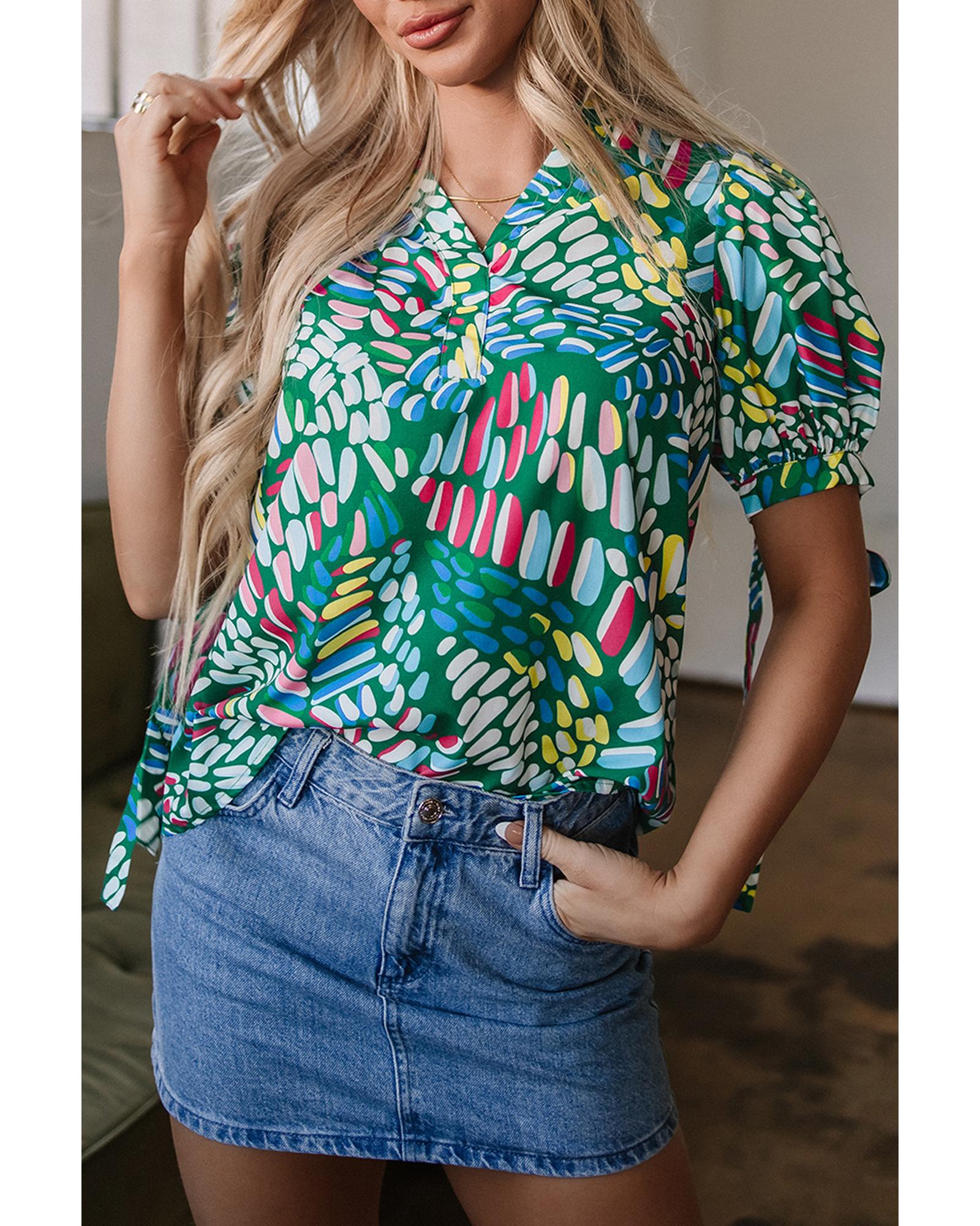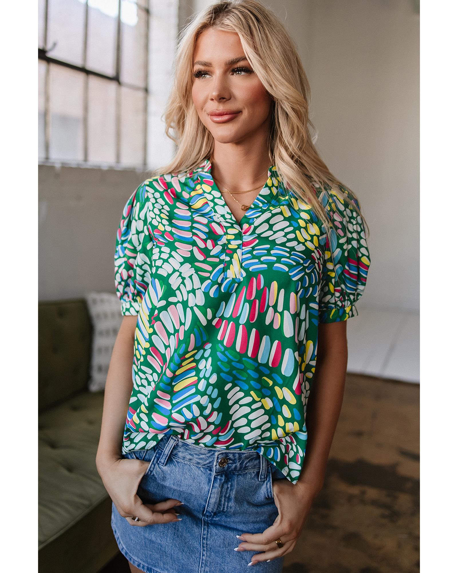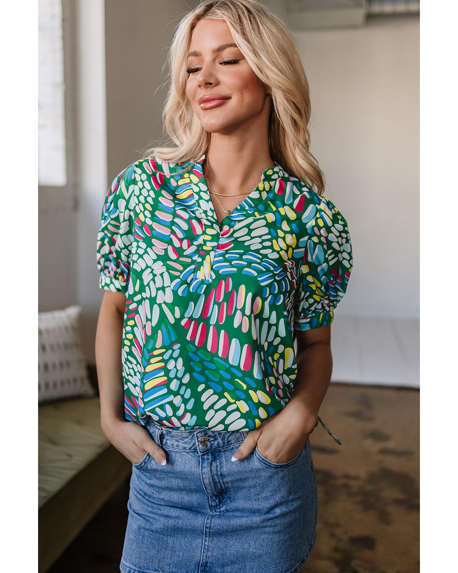 Green Brushwork Geometric Print Puff Sleeve Notched Neck Blouse – S