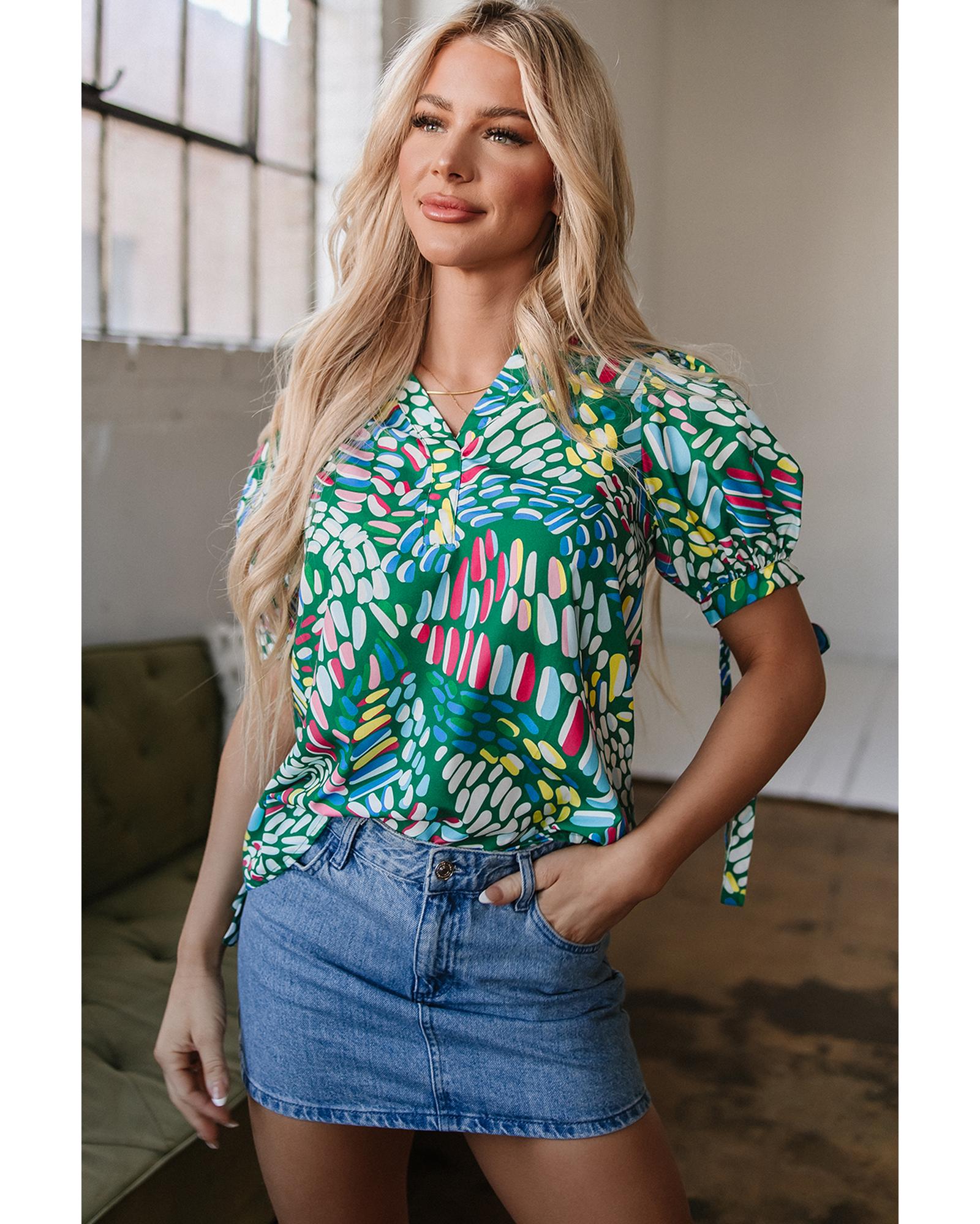 Green Brushwork Geometric Print Puff Sleeve Notched Neck Blouse – XL