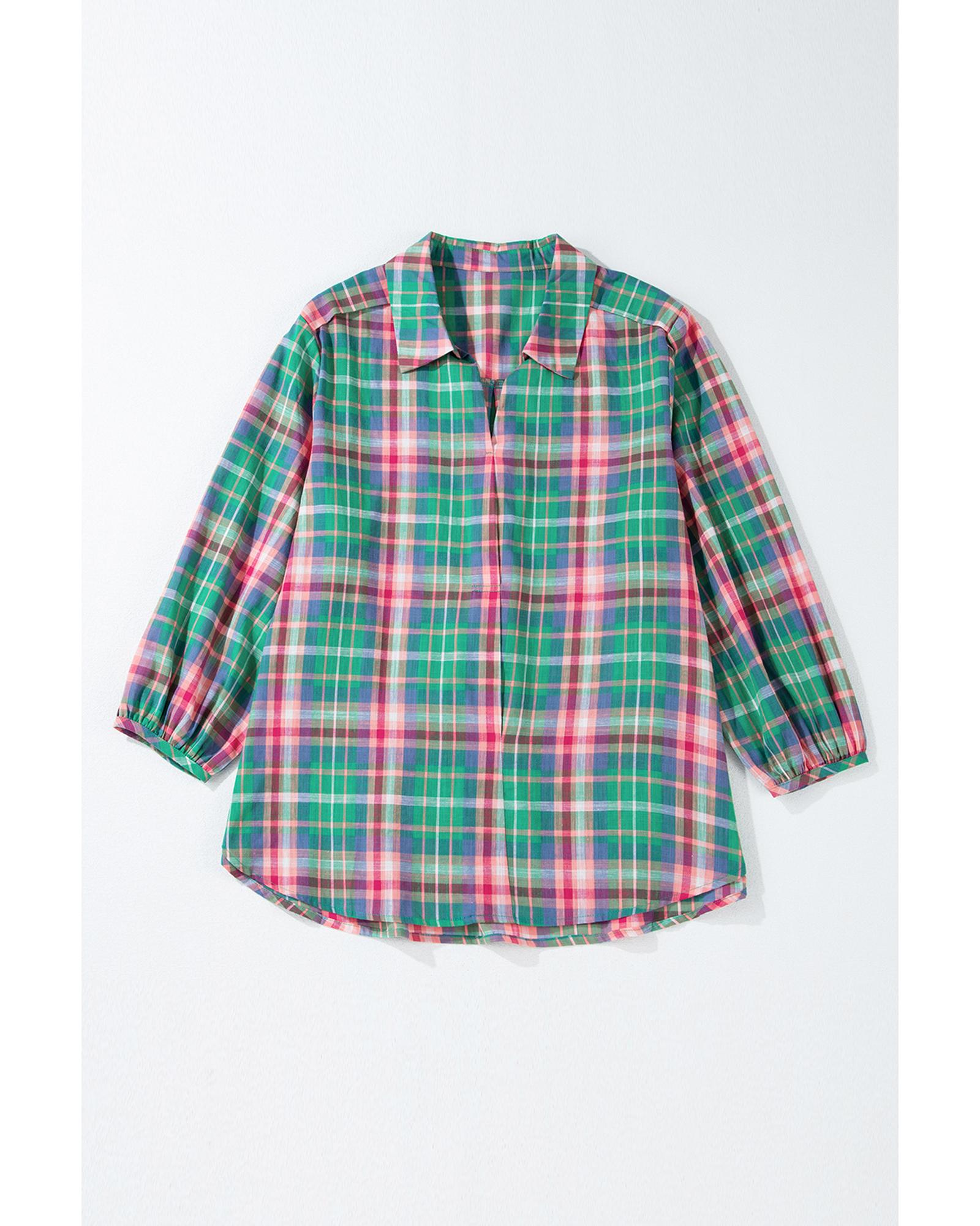 - Green Checkered 3/4 Sleeve Collared Loose Fit Shirt